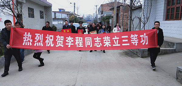 为进一步弘扬拥军优属的光荣传统,1月8日下午,沣西新城退役军人事务局副局长裴琨、大王街道人民武装部部长史缠宝,会同中国人民解放军火箭军某部送喜报小组共同为在部队荣立三等功的现役军人李程的家属送去“三等功”喜报及慰问金。