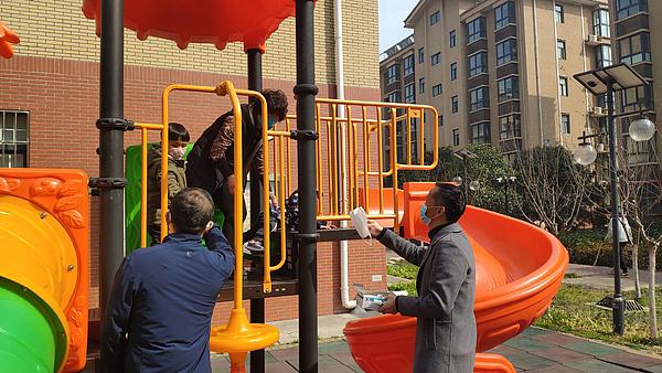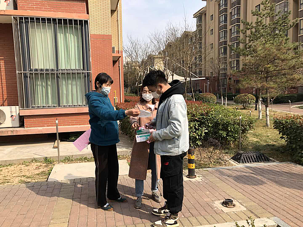 此次活动将党员同志分为两组,一组同志为同德佳苑社区住户发放一次性口罩、免洗手消毒液、家用八四消毒液等用品,向住户讲述预防新冠肺炎科普知识及散发宣传彩页,提醒住户们做好个人防护,与他人接触时做好安全措施;另一组同志组成环保志愿者,对小区内垃圾进行清扫,并告知小区住户将使用过的口罩投入固定垃圾箱,避免环境污染和细菌传播。