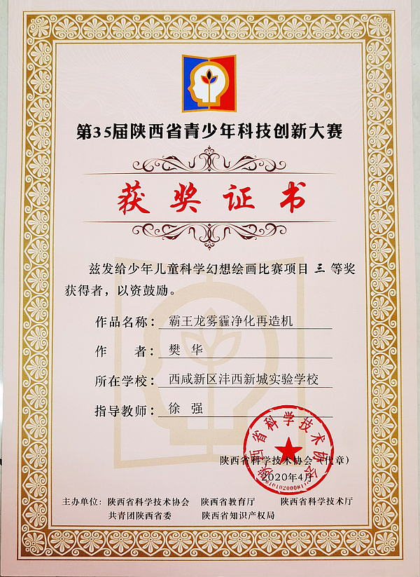 近日,第35届陕西省青少年科技创新大赛和西安市第18届青少年科普知识竞赛成果揭晓,沣西实验学校73名学生、3名教师获奖。其中,在陕西省教育厅、陕西省科技厅、共青团陕西省委、陕西省知识产权局、陕西省科学技术协会联合主办的陕西省青少年科技创新大赛上,学校三年级4班樊华同学的作品《霸王龙雾霾净化再造机》获得三等奖。在西安市教育局、共青团西安市委、西安市科学技术协会、西安市精神文明建设指导委员会办公室、西安市关心下一代工作委员会联合主办的第18届西安市青少年科普知识竞赛上,沣西实验学校被评为先进单位,一年级3班李梓彧等72名学生获奖,其中特等奖1名、一等奖1名、二等奖3名、三等奖67名,另外宋晶晶、薛茹心、苟婷三名教师被评为先进个人。
