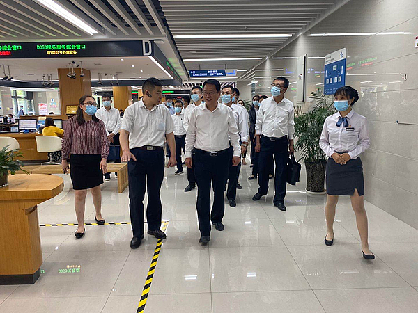 在政务服务中心,王少敏一行先后参观了税务综合、证照联办、不动产登记、社会事务等各业务区域,详细了解24小时自助服务区智能营业执照自主申领一体机功能及使用情况,并就政务服务中心标准化、推进“互联网+政务服务”等方面工作进行座谈交流。