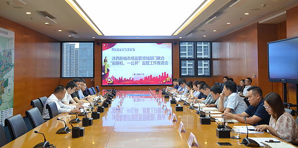 8月20日下午,沣西新城召开市场监管领域部门联合“双随机、一公开”监管工作推进会。新城党委委员、管委会副主任郑涛出席并讲话,新城“双随机、一公开”监管联席会议成员单位分管负责人和业务骨干共计40余人参加会议。
