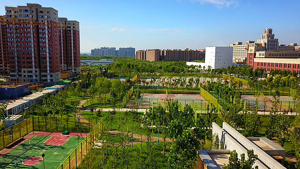 绿楔穿过五条交叉道路,被分割为六个地块,并设五座景观廊桥连接湖系两岸,驳岸内园路采用再生骨料铺设的环保生态步行道,把各个景观节点串联起来,汇聚成自然连接的统一体,为师生提供四通八达的路网系统。项目建有管理用房、田径运动场、篮球场、足球场、网球场等多处运动健康设施。设置的放映厅、儿童乐园、荷影厅等功能性景观节点,满足师生运动、休闲、观赏、晨读及生活需要。占有7000平方米的中心湖系,增加了校园的宁静和师生心情上的愉悦,与周围学校建筑楼群相得益彰。在植物配置方面,通过绿化造景展示创新港浓厚的文化气息和美好的精神风貌,使学生在潜移默化中获得情操品德和文化艺术的熏陶,特殊地块植物选择与文化底蕴相符相融,为创新港区域师生提供更加舒适、健康的优美环境。