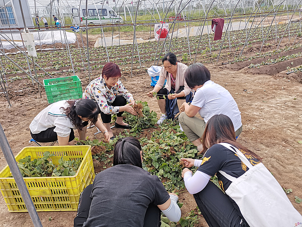活动中,大家热情高涨,干劲十足,分工协作。有的与群众一起搬运种苗、挑选壮苗……有的组装高架、配置栽培基质等。边干边聊,熟悉草莓种植技术,了解群众产业发展需求。在大家齐心协力下,完成2个设施大棚种苗栽植、20个钢制高架组装、100余个高架基质槽装填和移栽。
