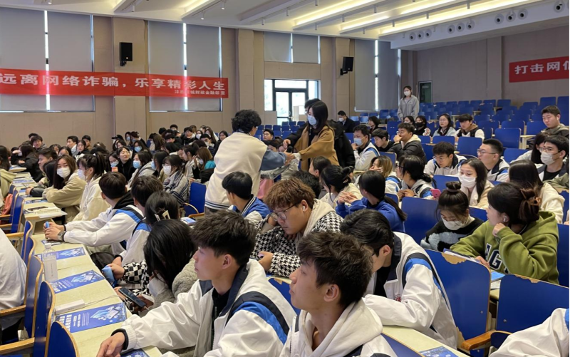 活动现场,工作人员通过张贴宣传标语、发放宣传彩页及专题讲座等形式,为广大学生普及了非法集资及网络诈骗的表现形式、防诈骗、反诈骗、断卡行动、征信知识进校园等相关内容。活动过程中还设置了有奖问答环节,在场学生参与积极性高,现场气氛十分活跃。活动结束后,学生会还召开了主题班会进行宣传,知晓率达到了90%以上。