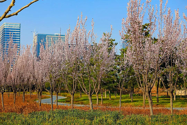 近处的花草苗木,与远处的城市楼群交相辉映,春日芳华,一展无余。