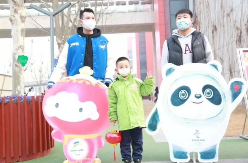 在校门口,学校放置冬奥口号、吉祥物、会徽等,同学们和可爱的冰墩墩、雪容融合影留念,感受浓厚冬奥氛围,留住美好童年。