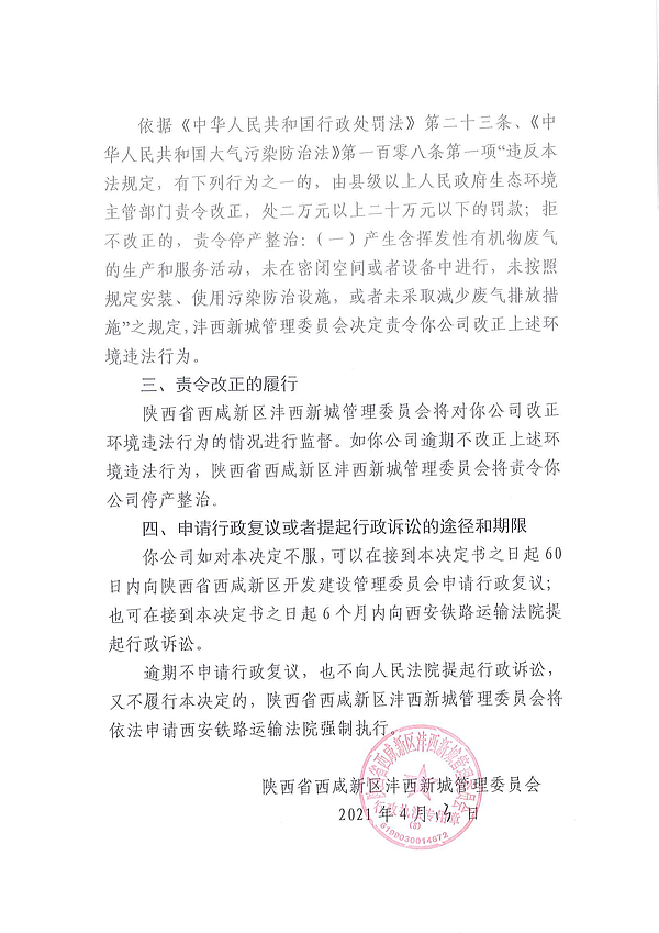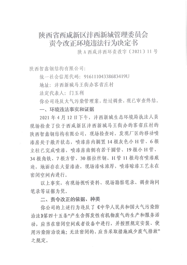 陕西智鑫钢结构有限公司责令改正环境违法行为决定书