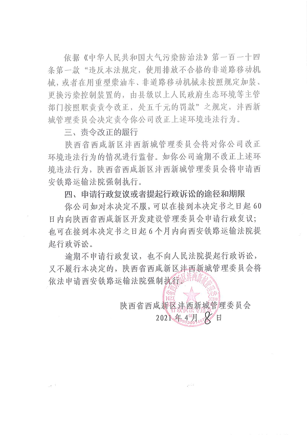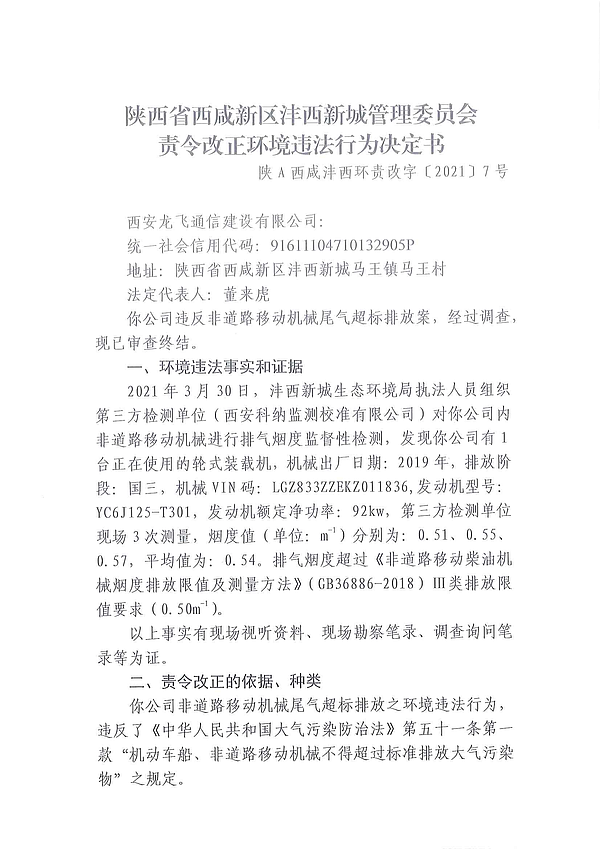 西安龙飞通信建设有限公司责令改正环境违法行为决定书