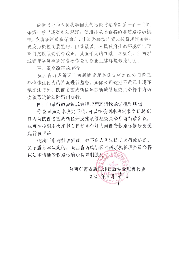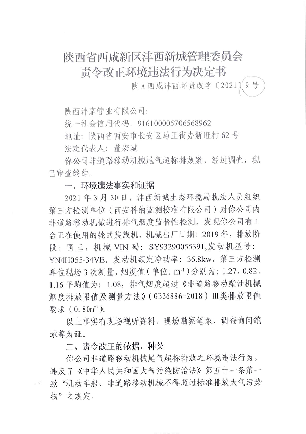 陕西沣京管业有限公司责令改正环境违法行为决定书