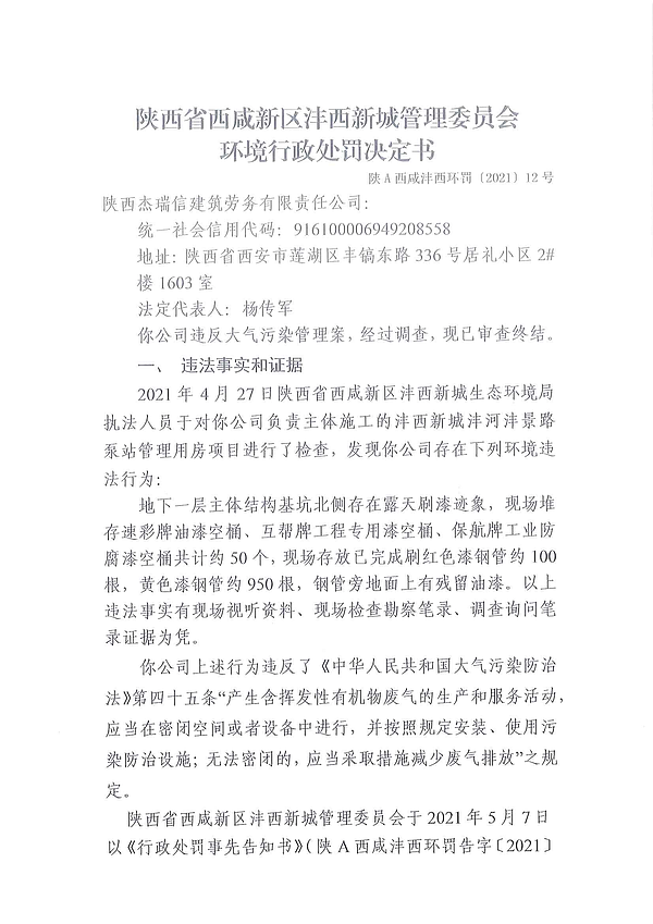 陕西杰瑞信建筑劳务有限责任公司环境行政处罚决定书