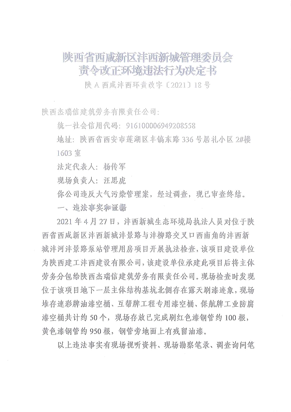 陕西杰瑞信建筑劳务有限责任公司责令改正环境违法行为决定书