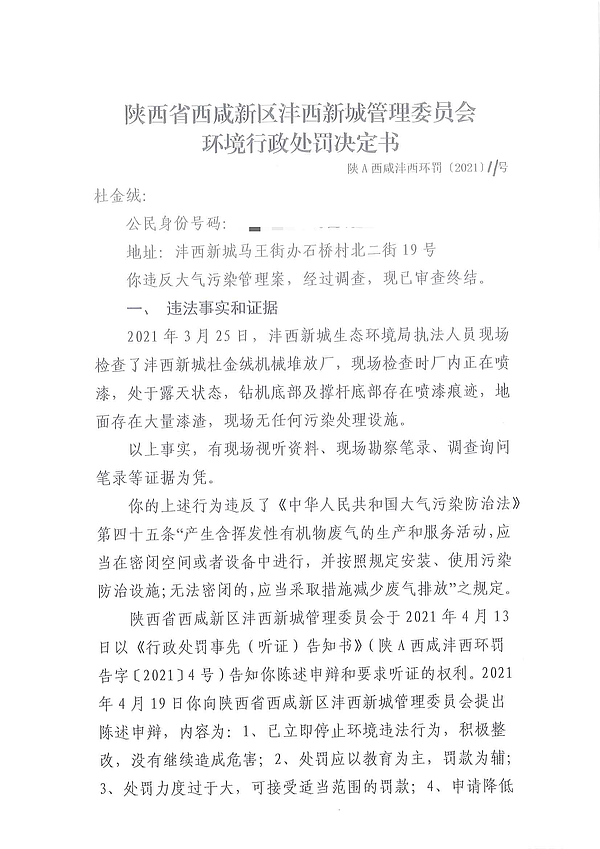 杜金绒环境行政处罚决定书