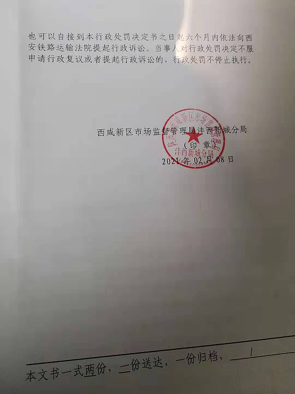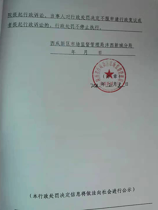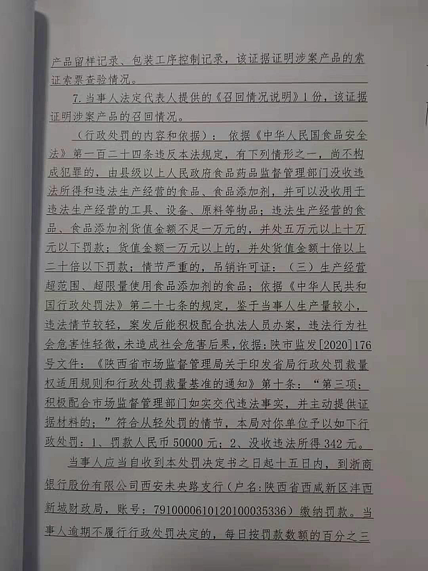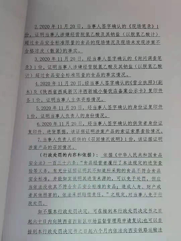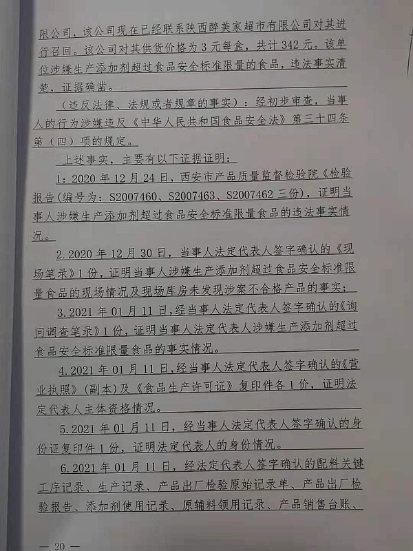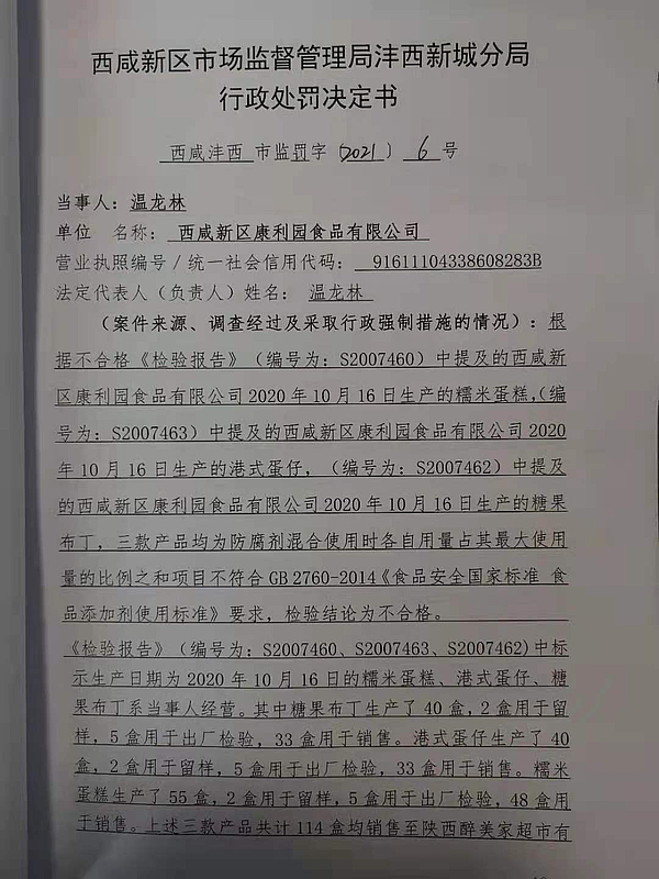 4 | (西咸沣西)市监罚字〔2021〕06号 | 西咸新区康利园食品有限公司涉嫌生产不合格食品案 | 西咸新区康利园食品有限公司 | 91611104338608283B | 温龙林 | 防腐剂混合使用时各自用量占其最大使用量的比例之和项目不符合GB 2760-2014《食品安全国家标准 食品添加剂使用标准》要求,检验结论为不合格 | 1、罚款人民币50000元;2、没收违法所得342元。 违反《中华人民共和国食品安全法》第三十四条第(四)项的规定依据《中华人民共和国食品安全法》第一百二十四条违反本法规定,有下列情形之一,尚不构成犯罪的,由县级以上人民政府食品药品监督管理部门没收违法所得和违法生产经营的食品、食品添加剂,并可以没收用于违法生产经营的工具、设备、原料等物品;违法生产经营的食品、食品添加剂货值金额不足一万元的,并处五万元以上十万元以下罚款;货值金额一万元以上的,并处货值金额十倍以上二十倍以下罚款;情节严重的,吊销许可证: | 自接到行政处罚决定书之日起15日内 | 西咸新区市场监督管理局沣西新城分局 2021年03月10日 |