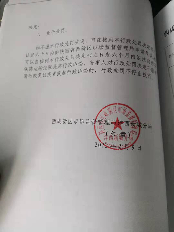 1 | (西咸沣西)市监不处字〔2021〕07号 | 沣西新城芊宥特色小吃店涉嫌经营不符合食品安全标准的食品案 | 沣西新城芊宥特色小吃店 | 92611104MA6TLNAJ0Q | 刘阿妹 | 经营不符合食品安全标准的食品案 | 免予行政处罚 违反《陕西省小作坊、小餐饮及小摊贩管理条例》第十二条第(六)项 依据第一百三十六条 食品经营者履行了本法规定的进货查验等义务,有充分证据证明其不知道所采购的食品不符合食品安全标准,并能如实说明其进货来源的,可以免予处罚,但应当依法没收其不符合食品安全标准的食品;造成人身、财产或者其他损害的,依法承担赔偿责任。 条 | 自接到行政处罚决定书之日起15日内 | 西咸新区市场监督管理局沣西新城分局 2021年02月06日 | |