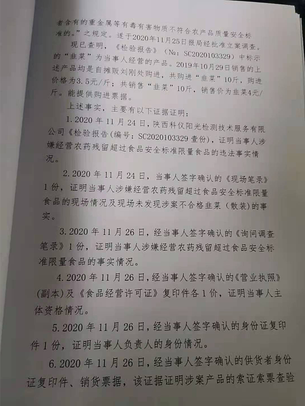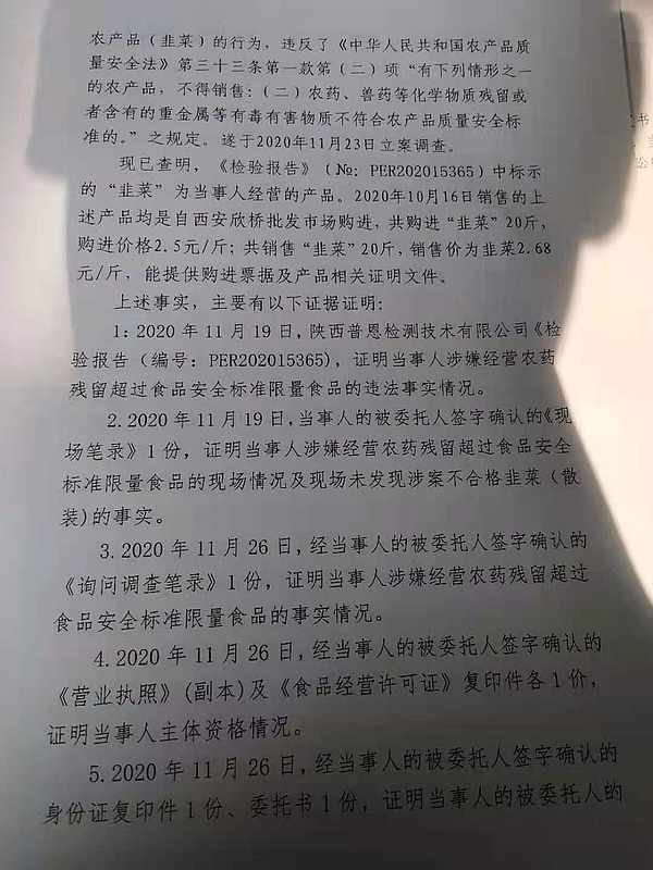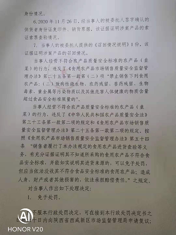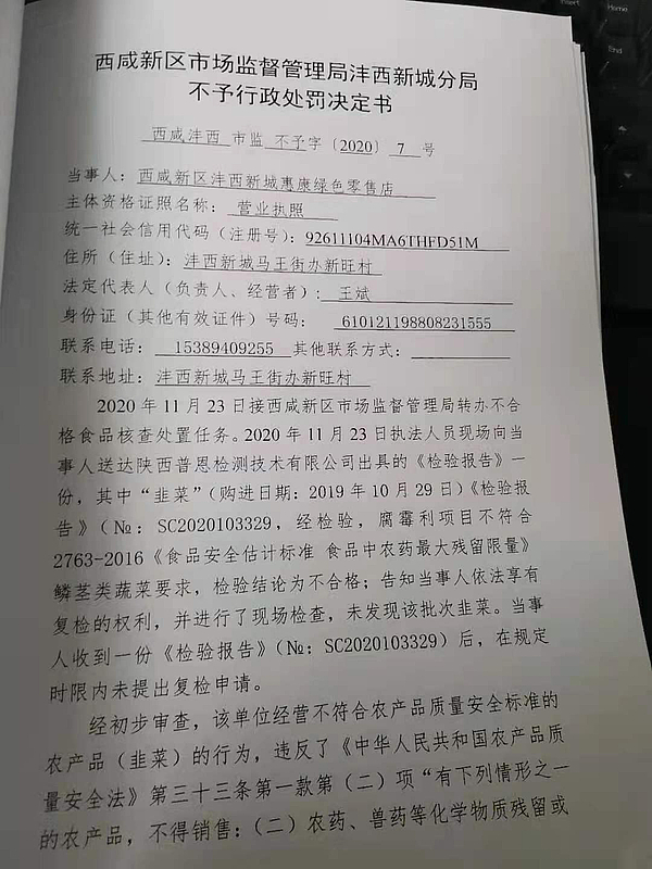 3 | (西咸沣西)市监不处字〔2021〕06号 | 西咸新区沣西新城惠康绿色零售店抽检不合格案 | 西咸新区沣西新城惠康绿色零售店 | 92611104MA6THFD51M | 王斌 | 韭菜,腐霉利项目不符合GB2763-2019《食品安全国家标准 食品中农药最大残留限量》要求,检验结论为不合格 | 1、免予行政处罚。 违反《食用农产品市场销售质量安全监督管理办法》第二十五条第(二)项的规定依据《食用农产品市场销售质量安全监督管理办法》第五十四条:“销售案者履行了本办法规定的食用农产品进货查验等义务,有充分证据证明其不知道所采购的食用农产品不符合食品安全标准,并能如实说明其进货来源的,可以免予处罚,但应当依法没收其不符合食品安全标准的食用农产品;造成人身、财产或者其他损害的,依法承担赔偿责任”之规定,对当事人免予行政处罚。 | 自接到行政处罚决定书之日起15日内 | 西咸新区市场监督管理局沣西新城分局 2021年02月8日 | |