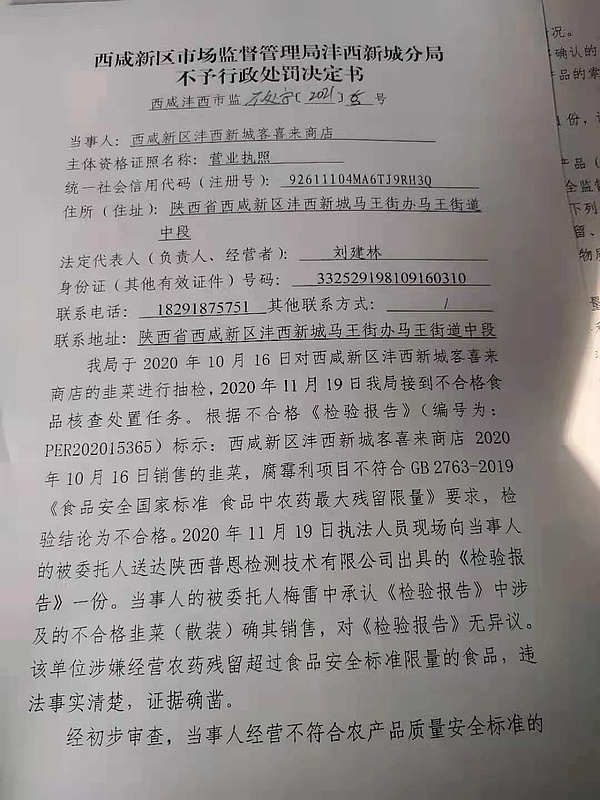 2 | (西咸沣西)市监不处字〔2021〕05号 | 西咸新区沣西新城客喜来商店抽检不合格案 | 西咸新区沣西新城客喜来商店 | 92611104MA6TJ9RH3Q | 刘建林 | 韭菜,腐霉利项目不符合GB2763-2019《食品安全国家标准 食品中农药最大残留限量》要求,检验结论为不合格。 | 1、免予行政处罚。 违反《食用农产品市场销售质量安全监督管理办法》第二十五条第(二)项的规定依据《食用农产品市场销售质量安全监督管理办法》第五十四条:“销售案者履行了本办法规定的食用农产品进货查验等义务,有充分证据证明其不知道所采购的食用农产品不符合食品安全标准,并能如实说明其进货来源的,可以免予处罚,但应当依法没收其不符合食品安全标准的食用农产品;造成人身、财产或者其他损害的,依法承担赔偿责任”之规定,对当事人免予行政处罚。 | 自接到行政处罚决定书之日起15日内 | 西咸新区市场监督管理局沣西新城分局 2021年2月8日 | |