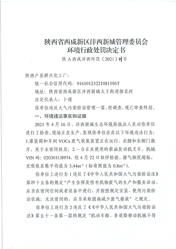 陕西户县群兴化工厂环境行政处罚决定书