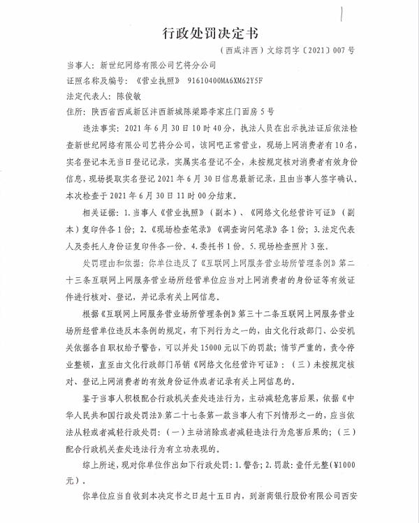 2 | (西咸沣西)文综罚字〔2021〕007号 | 新世纪网络有限公司艺将分公司未按规定核对、登记上网消费者的有效身份证件或者记录有关上网信息案 | 新世纪网络有限公司艺将分公司 | 91610400MA6XM62Y5F | 陈俊敏 | 未按规定核对、登记上网消费者的有效身份证件或者记录有关上网信息 | 依据《互联网上网服务营业场所管理条例》第三十二条之规定,给予以下行政处罚:1.警告;2.罚款:壹仟元整(¥1000元)。 | 自接到行政处罚决定书之日起15日内 | 西咸新区沣西新城文化市场综合执法大队 2021年7月16日 |