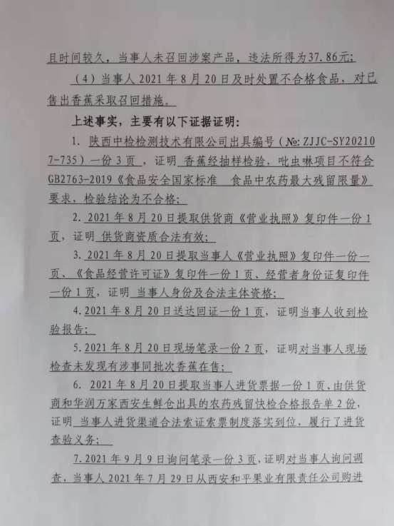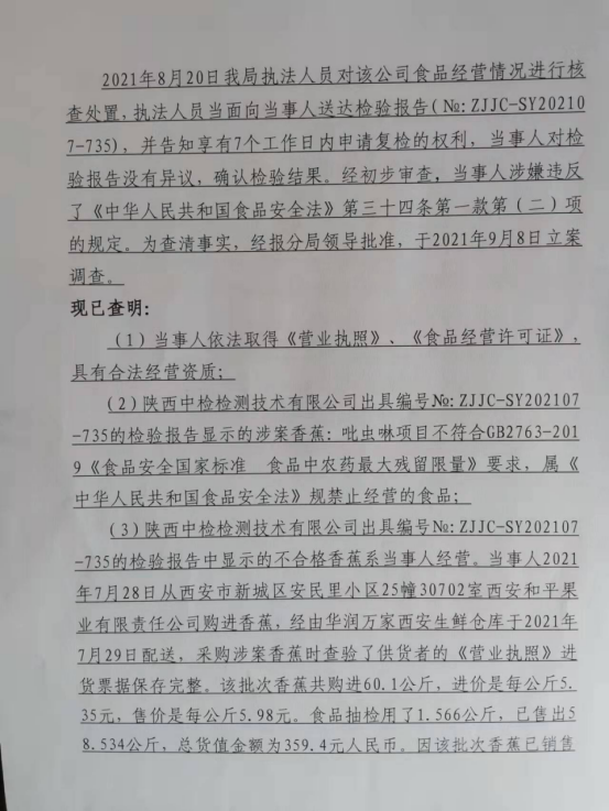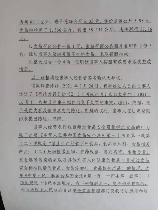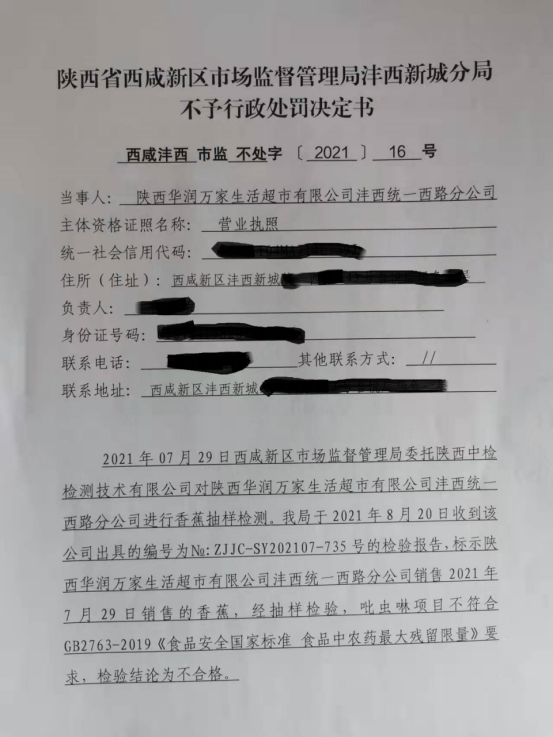1 | 西咸沣西市监不处字〔2021〕16号 | 陕西华润万家生活超市有限公司沣西统一西路分公司经营农药残留含量超过食品安全标准限量的食品案 | 陕西华润万家生活超市有限公司沣西统一西路分公司 | 92611104MA714L739J | 徐健 | 经营农药残留含量超过食品安全标准限量的食品案 | 不予行政处罚。 违反《中华人民共和国食品安全法》第三十四条第一款第(二)项之规定; 依据《中华人民共和国食品安全法》第一百三十六条。 | 立即履行 | 西咸新区市场监督管理局沣西新城分局 2021年10月11日 | |