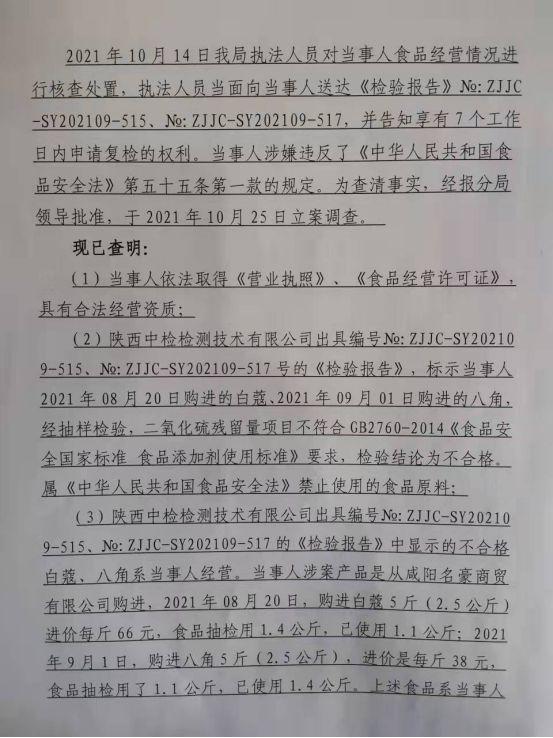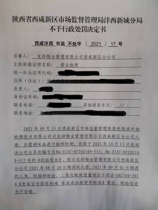 2 | 西咸沣西市监不处字〔2021〕17号 | 龙祥物业管理有限公司西咸新区分公司采购使用不符合食品安全标准的食品原料案 | 龙祥物业管理有限公司西咸新区分公司 | 91611104MA6TUGA72H | 付瑜斌 | 采购使用不符合食品安全标准的食品原料案 | 不予行政处罚。 违反《中华人民共和国食品安全法》第五十五条第一款的规定; 依据《中华人民共和国食品安全法》第一百三十六条。 | 立即履行 | 西咸新区市场监督管理局沣西新城分局 2021年11月9日 |