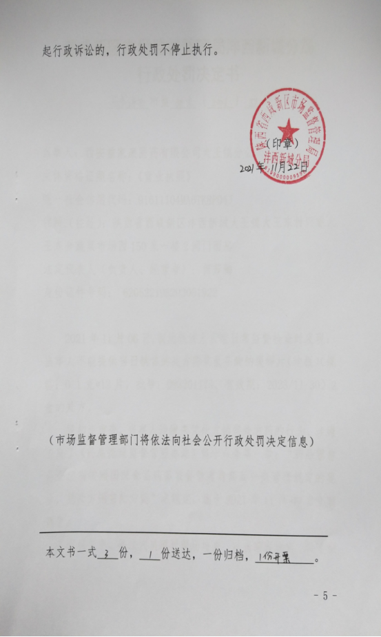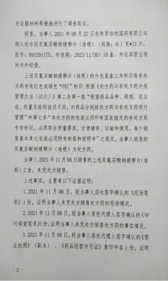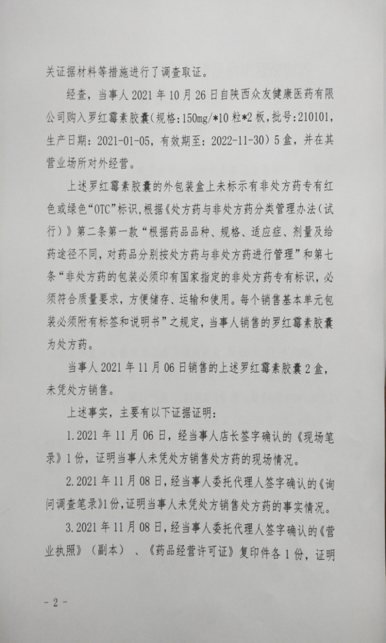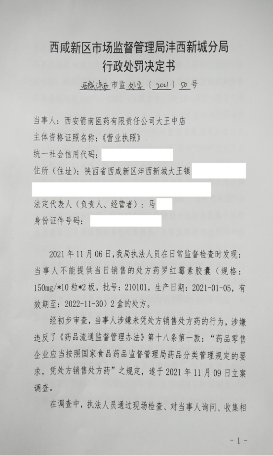 1 | (西咸沣西)市监处字〔2021〕50号 | 西安箭南医药有限责任公司大王中店未凭处方销售处方药案 | 西安箭南医药有限责任公司大王中店 | 91610125MA6UQ0WC9B | 马会锋 | 未凭处方销售处方药 | 1、处以罚款800元。 违反《药品流通监督管理办法》第十八条第一款。 依据《药品流通监督管理办法》第三十八条第一款。 | 自接到行政处罚决定书之日起15日内 | 西咸新区市场监督管理局沣西新城分局 2021年11月22日 |