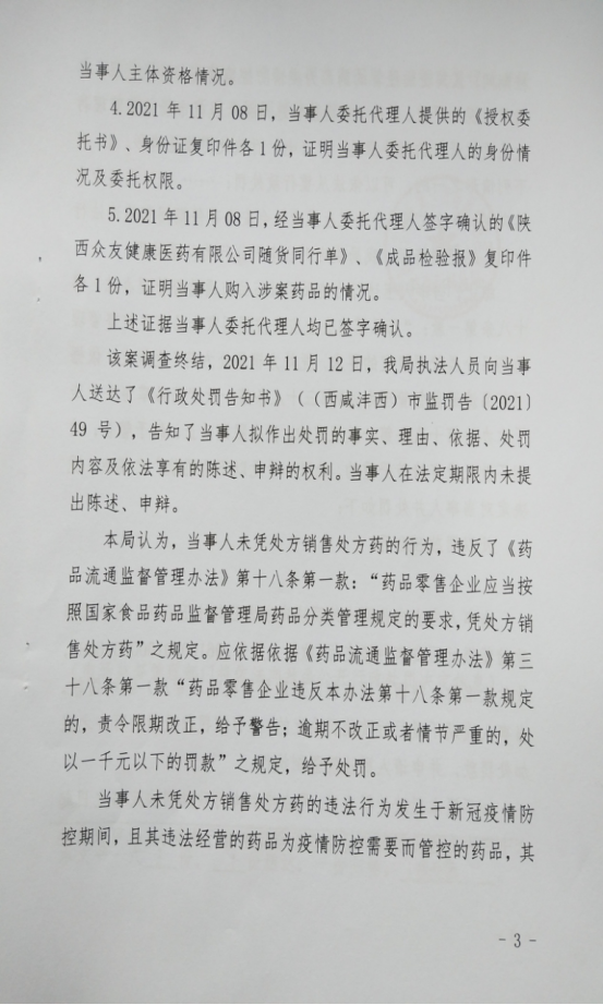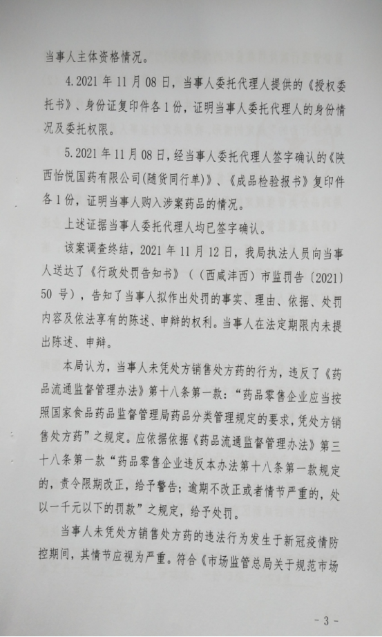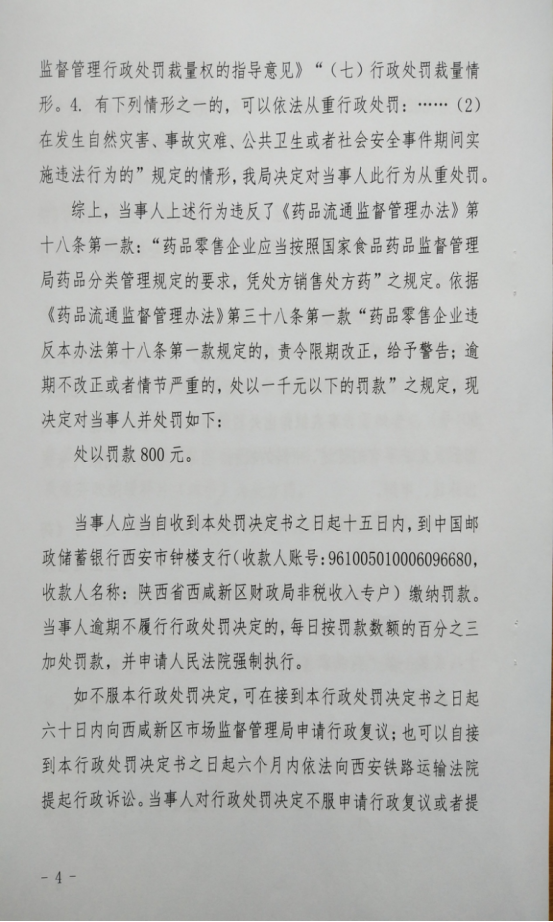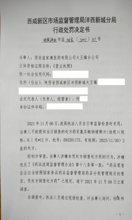 2 | (西咸沣西)市监处字〔2021〕51号 | 西安益家康医药有限公司大王镇分公司未凭处方销售处方药案 | 西安益家康医药有限公司大王镇分公司 | 91611104MA6TK8P04J | 何芳梅 | 未凭处方销售处方药 | 1、处以罚款800元。 违反《药品流通监督管理办法》第十八条第一款。 依据《药品流通监督管理办法》第三十八条第一款。 | 自接到行政处罚决定书之日起15日内 | 西咸新区市场监督管理局沣西新城分局 2021年11月22日 |
