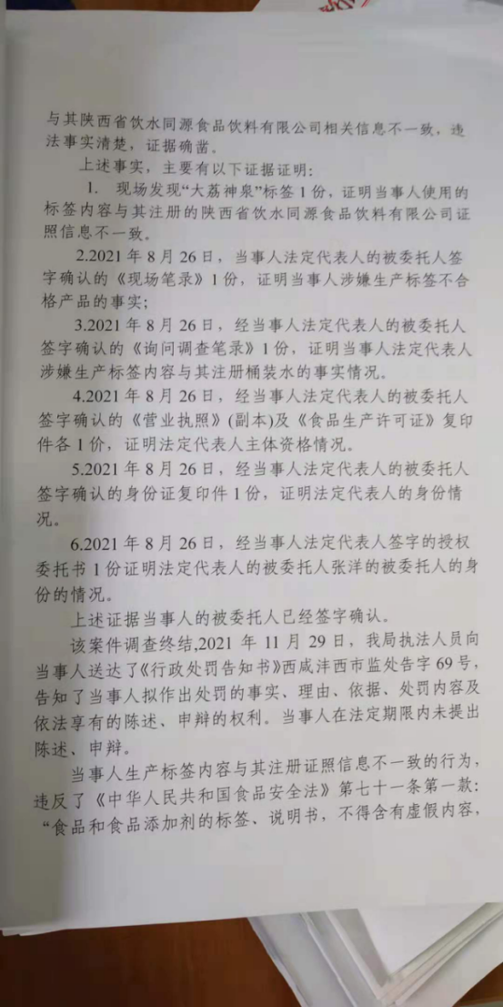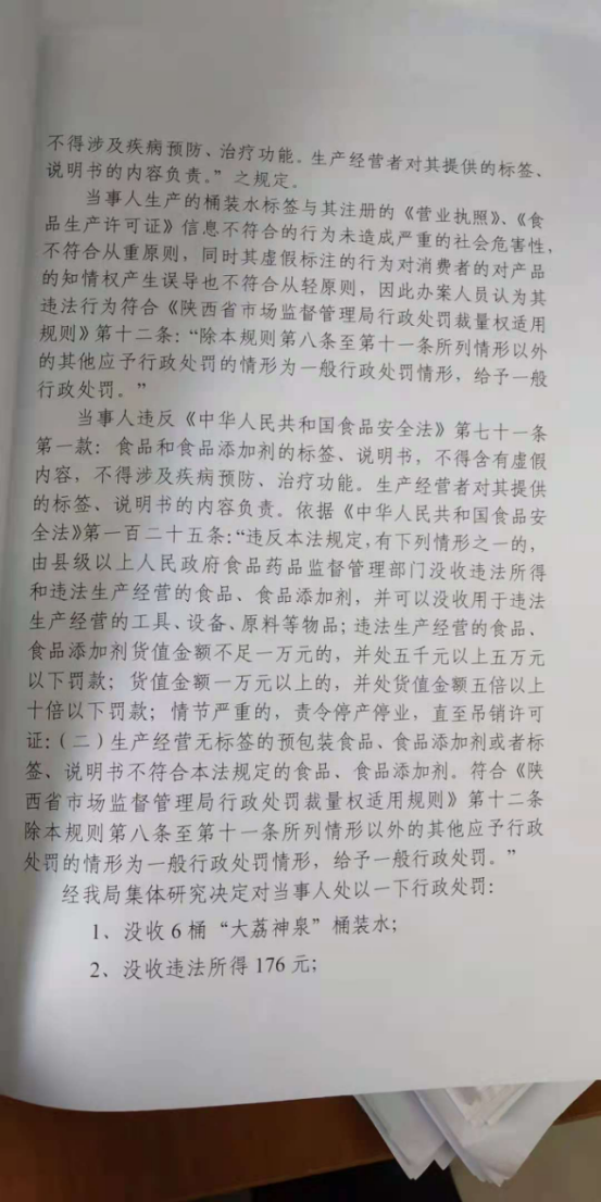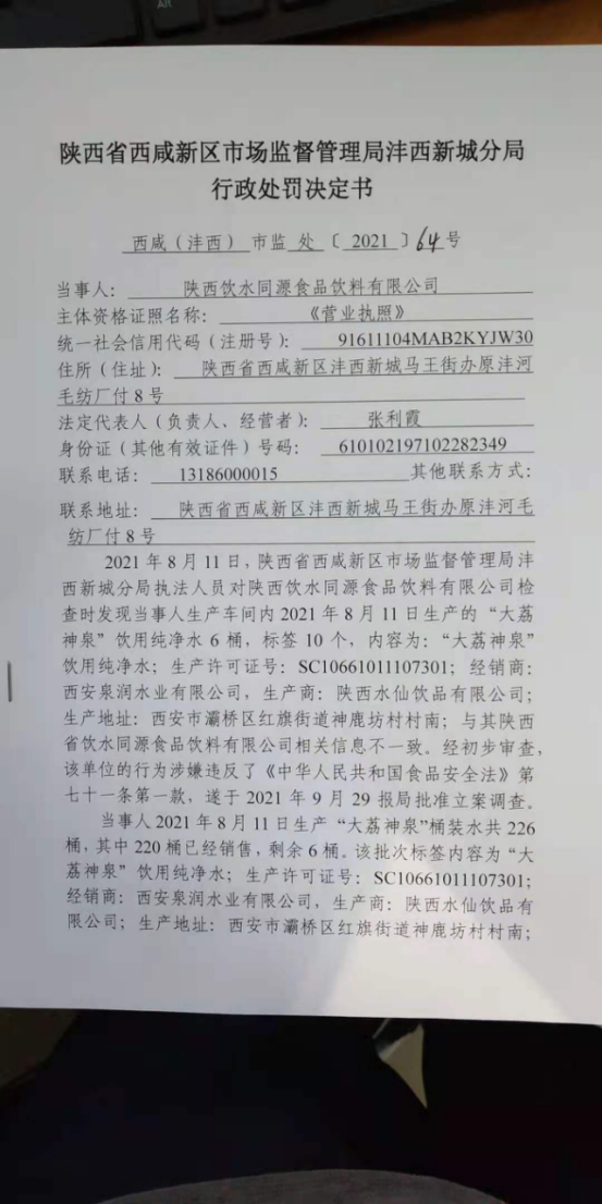 1 | (西咸沣西)市监处字〔2021〕64号 | 陕西饮水同源食品饮料有限公司涉嫌生产不合格产品案 | 陕西饮水同源食品饮料有限公司 | 91611104MAB2KYJW30 | 汪苗苗 | 生产标签不合格桶装水案 | 违反《中华人民共和国食品安全法》第七十一条第一款:食品和食品添加剂的标签、说明书,不得含有虚假内容,不得涉及疾病预防、治疗功能。生产经营者对其提供的标签、说明书的内容负责。符合《陕西省市场监督管理局行政处罚裁量权适用规则》第十二条:“除本规则第八条至第十一条所列情形以外的其他应予行政处罚的情形为一般行政处罚情形,给予一般行政处罚。”依据《中华人民共和国食品安全法》第一百二十五条 违反本法规定,有下列情形之一的,由县级以上人民政府食品药品监督管理部门没收违法所得和违法生产经营的食品、食品添加剂,并可以没收用于违法生产经营的工具、设备、原料等物品;违法生产经营的食品、食品添加剂货值金额不足一万元的,并处五千元以上五万元以下罚款;货值金额一万元以上的,并处货值金额五倍以上十倍以下罚款;情节严重的,责令停产停业,直至吊销许可证: (二)生产经营无标签的预包装食品、食品添加剂或者标签、说明书不符合本法规定的食品、食品添加剂。处罚建议: 1、没收6桶“大荔神泉”桶装水;2、没收违法所得176元;3、罚款人民币20000元。