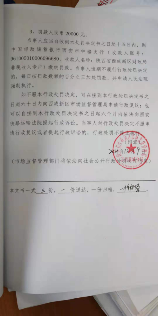 | 自接到行政处罚决定书之日起15日内 | 西咸新区市场监督管理局沣西新城分局 2021年12月10日 |