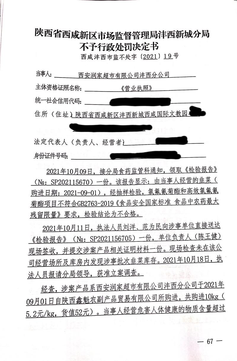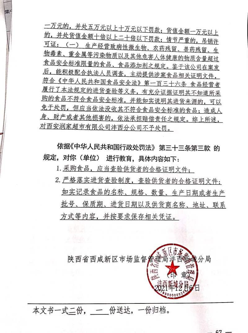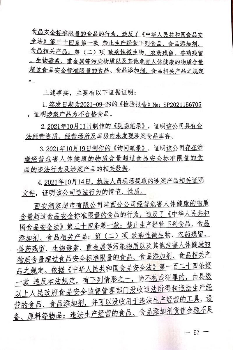 西安润家超市有限公司沣西分公司经营危害人体健康的物质超过食品安全标准限量的食品案