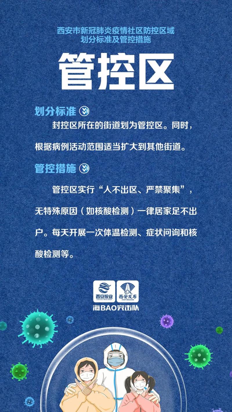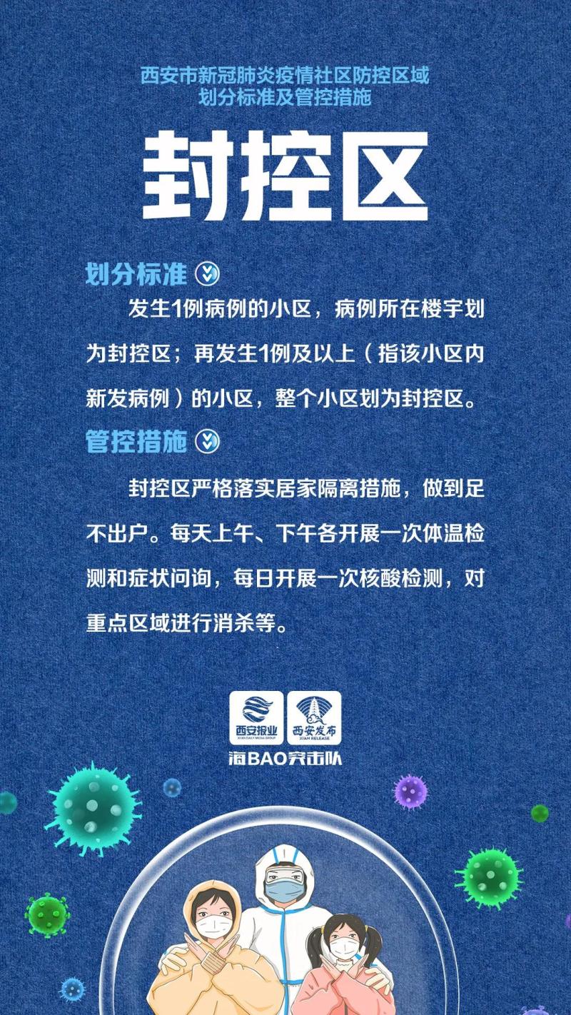 一是封控区。发生1例病例的小区,病例所在楼宇划为封控区;再发生1例及以上(指该小区内新发病例)的小区,整个小区划为封控区。封控区严格落实居家隔离措施,做到足不出户。每天上午、下午各开展一次体温检测和症状问询,每日开展一次核酸检测,对重点区域进行消杀等。