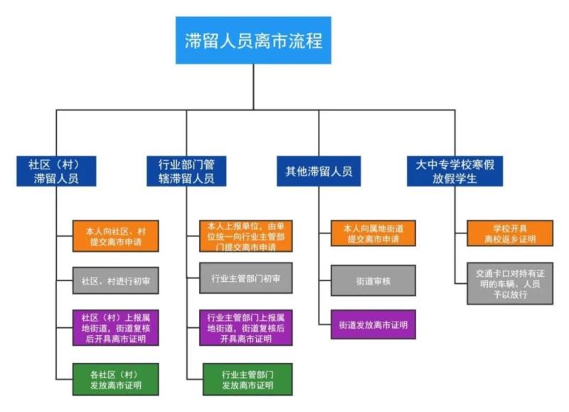 (1)提交申请:社区(村)居住的滞留人员,由本人向社区、村提交离市申请,社区、村进行初审;社区(村)之外行业部门管辖的滞留人员,由滞留人员所在单位统一向行业主管部门提交离市申请,由行业主管部门进行初审;其他滞留人员向属地街道提交离市申请,街道进行初审;大中专学校寒假放假学生由学校开具离校返家证明。