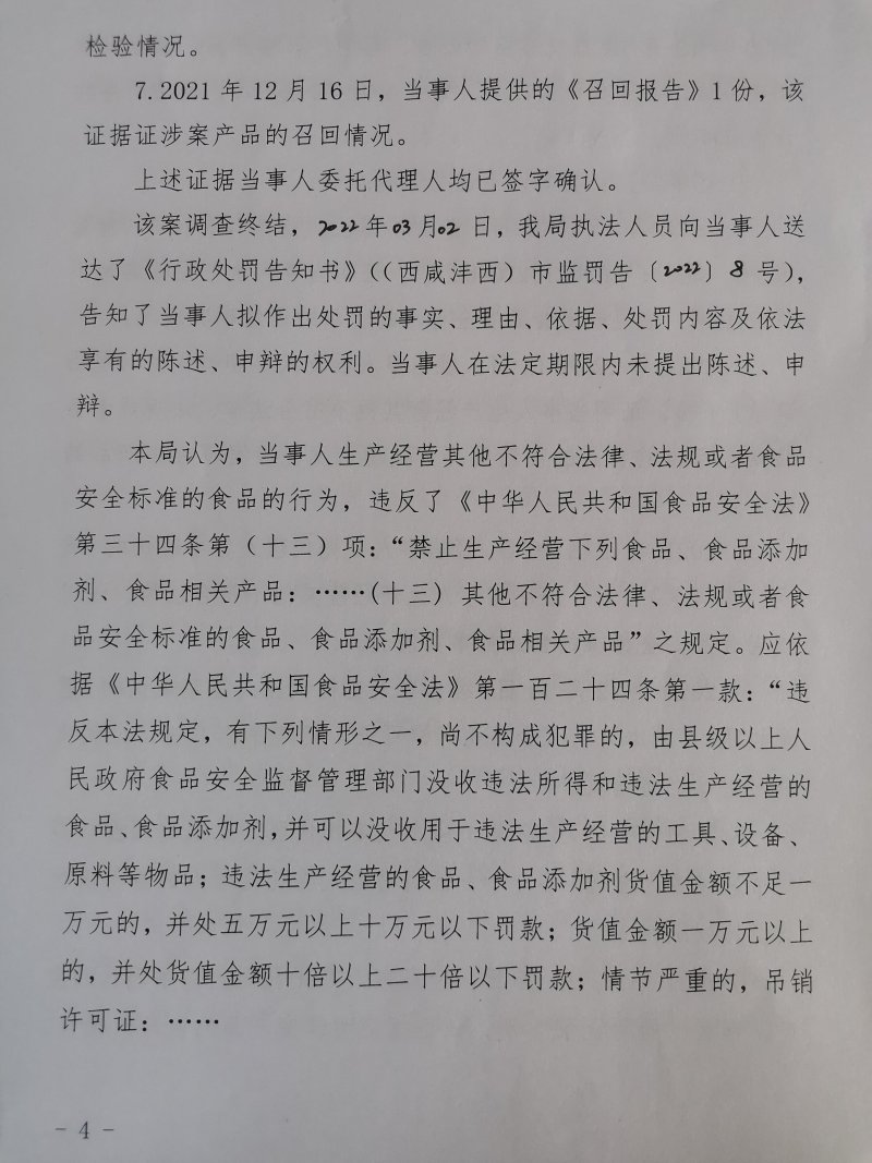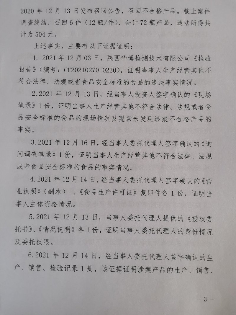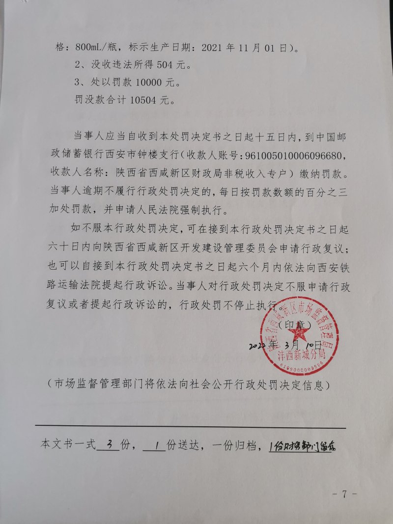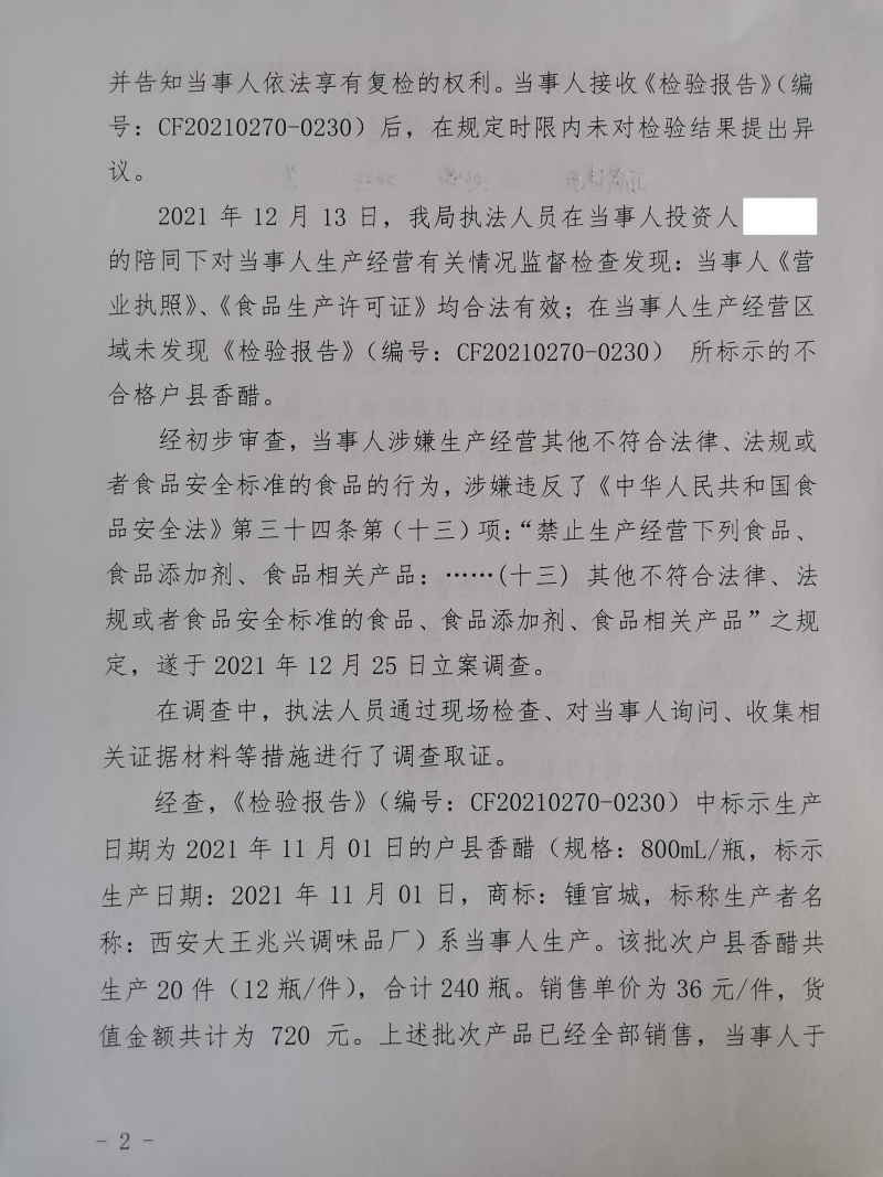 1 | (西咸沣西)市监处罚〔2022〕9号 | 西安大王兆兴调味品厂生产其他不符合法律、法规或者食品安全标准的食品案 | 西安大王兆兴调味品厂 | 916101255874213218 | 毛雪峰 | 生产其他不符合法律、法规或者食品安全标准的食品 | 1、没收已召回的户县香醋6件(12瓶/件),合计72瓶(规格:800mL/瓶,标示生产日期:2021年11月01日)。 2、没收违法所得504元。 3、处以罚款10000元。 违反《中华人民共和国食品安全法》第三十四条第(十三)项。 依据《中华人民共和国食品安全法》第一百二十四条第一款、第二款。 | 自接到行政处罚决定书之日起15日内 | 西咸新区市场监督管理局沣西新城分局 2022年03月10日 |