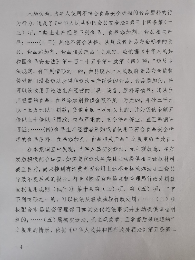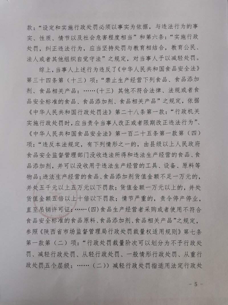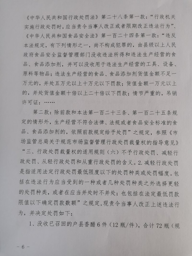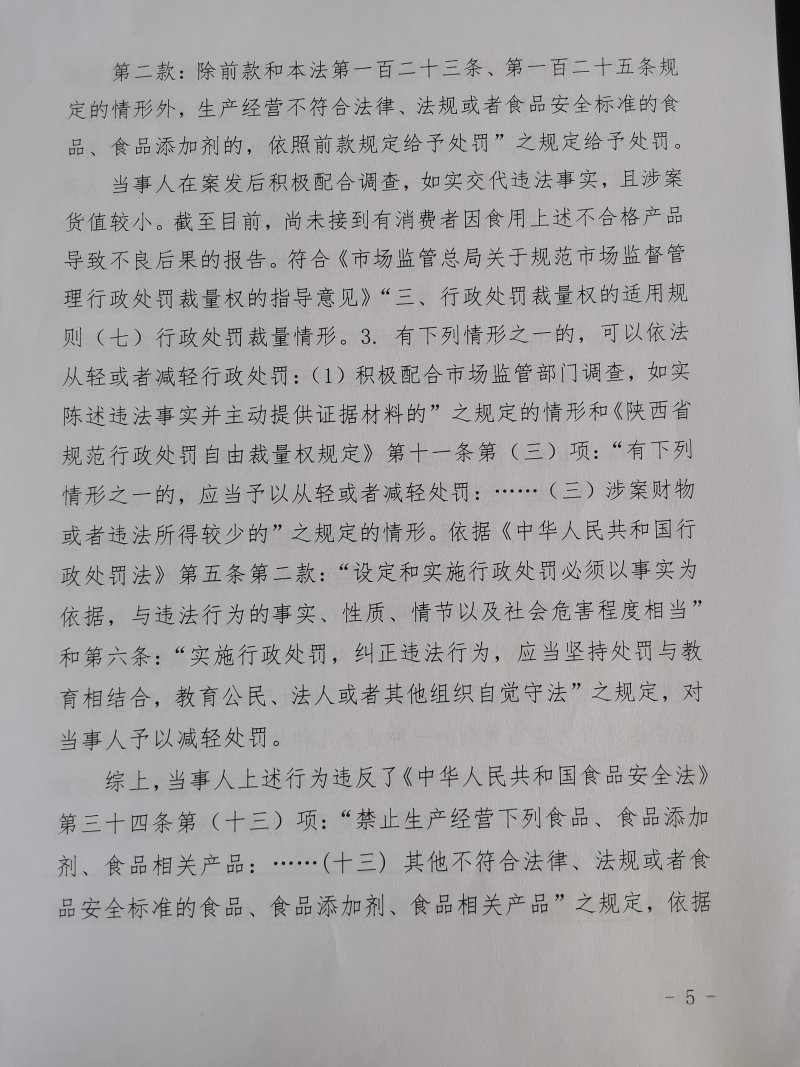 1 | (西咸沣西)市监处罚〔2022〕9号 | 西安大王兆兴调味品厂生产其他不符合法律、法规或者食品安全标准的食品案 | 西安大王兆兴调味品厂 | 916101255874213218 | 毛雪峰 | 生产其他不符合法律、法规或者食品安全标准的食品 | 1、没收已召回的户县香醋6件(12瓶/件),合计72瓶(规格:800mL/瓶,标示生产日期:2021年11月01日)。 2、没收违法所得504元。 3、处以罚款10000元。 违反《中华人民共和国食品安全法》第三十四条第(十三)项。 依据《中华人民共和国食品安全法》第一百二十四条第一款、第二款。 | 自接到行政处罚决定书之日起15日内 | 西咸新区市场监督管理局沣西新城分局 2022年03月10日 |