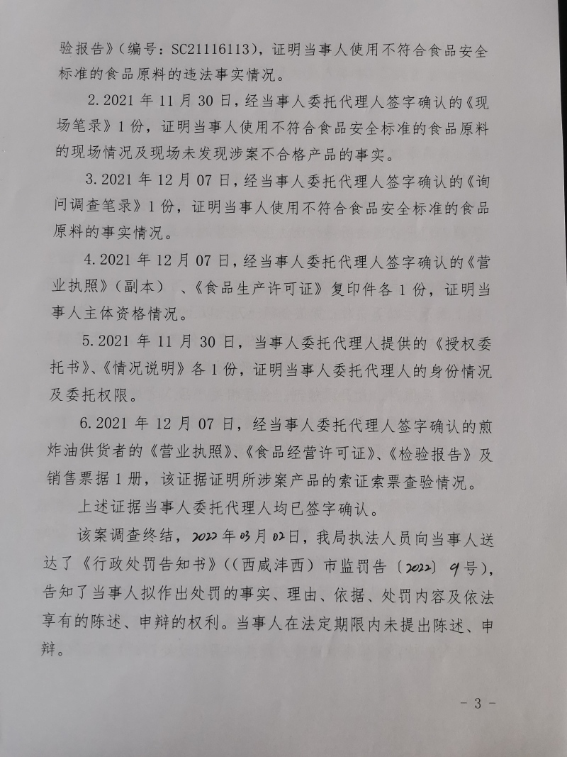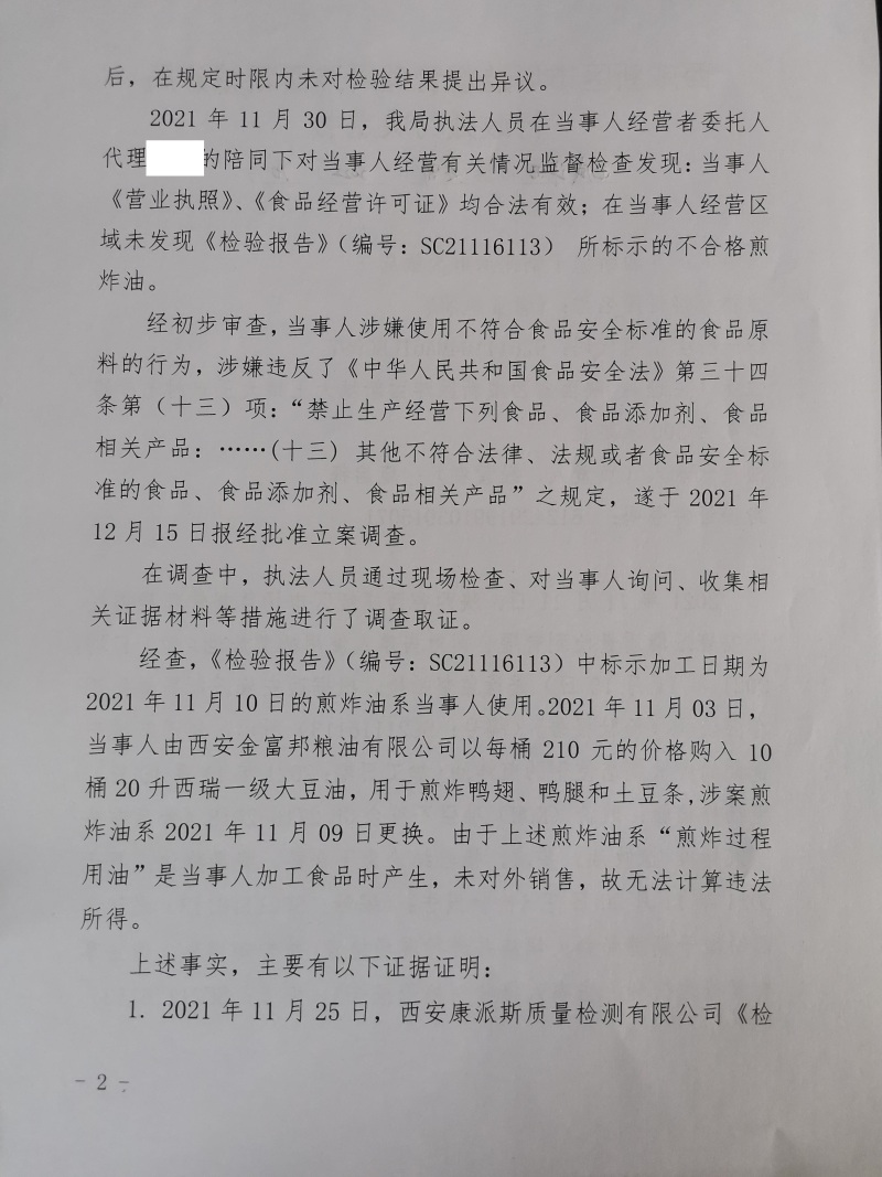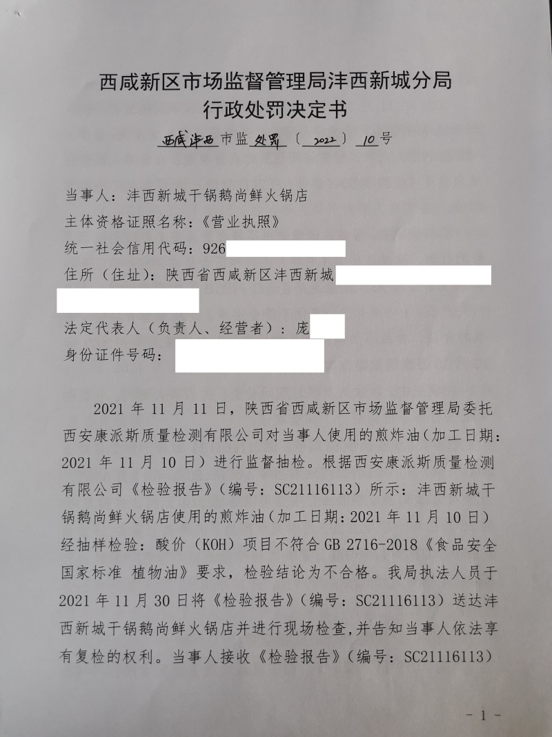 2 | (西咸沣西)市监处罚〔2022〕10号 | 沣西新城干锅鹅尚鲜火锅店使用不符合食品安全标准的食品原料案 | 沣西新城干锅鹅尚鲜火锅店 | 92611104MA6TLBC997 | 庞启锋 | 使用不符合食品安全标准的食品原料 | 1、处以罚款1000元。 违反《中华人民共和国食品安全法》第三十四条第(十三)项。 依据《中华人民共和国食品安全法》第一百二十五条第一款第(四)项。 | 自接到行政处罚决定书之日起15日内 | 西咸新区市场监督管理局沣西新城分局 2022年03月10日 |