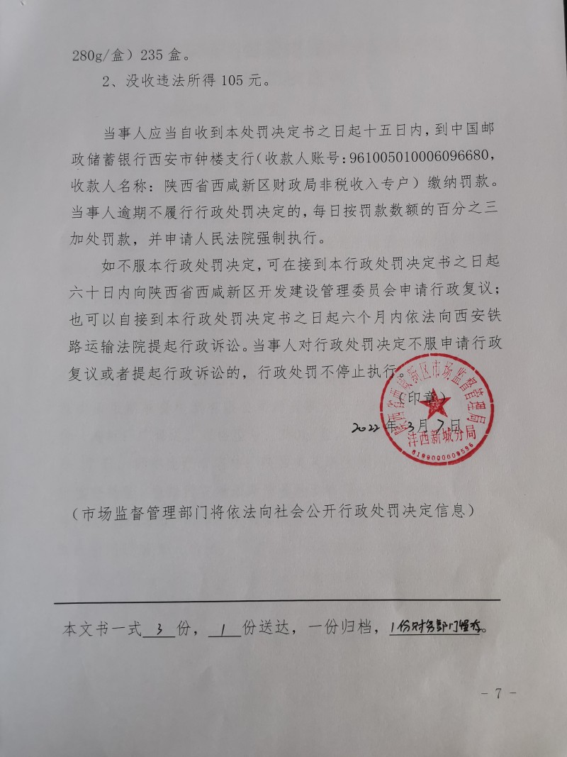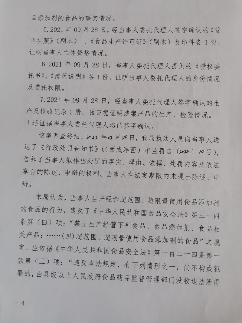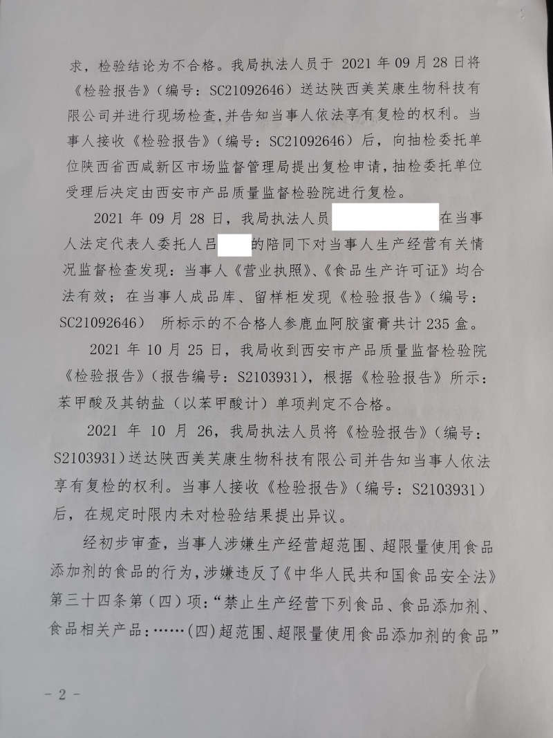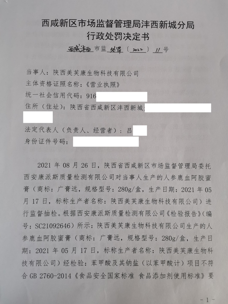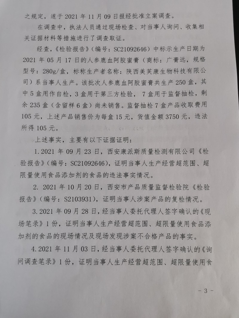 3 | (西咸沣西)市监处罚〔2022〕11号 | 陕西美芙康生物科技有限公司生产经营超范围、超限量使用食品添加剂的食品案 | 陕西美芙康生物科技有限公司 | 91610125322336674Y | 吕东丰 | 生产经营超范围、超限量使用食品添加剂的食品 | 1、没收涉案人参鹿血阿胶蜜膏(商标:广膏远,规格型号:280g/盒)235盒。2、没收违法所得105元。 违反《中华人民共和国食品安全法》第三十四条第(四)项。 依据《中华人民共和国食品安全法》第一百二十四条第一款第(三)项 | 自接到行政处罚决定书之日起15日内 | 西咸新区市场监督管理局沣西新城分局 2022年03月10日 |