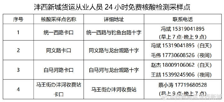 根据西安市相关防疫政策,货运物流从业人员必须每24小时进行一次核酸检测,为方便广大从业人员,沣西新城在辖区内设置4处免费核酸检测点位,货运从业人员可每日凭借从业资格证免费进行一次核酸检测,时间为2022年4月14日0时至2022年4月16日24时。