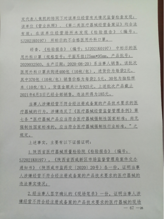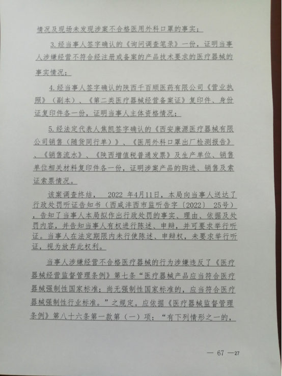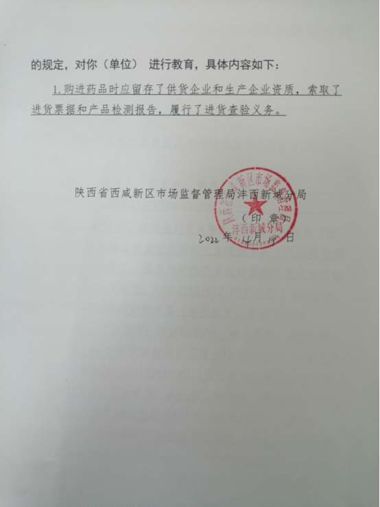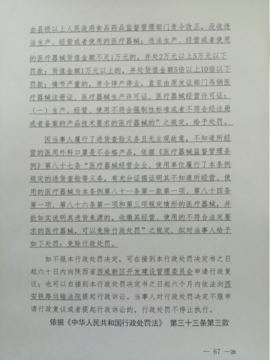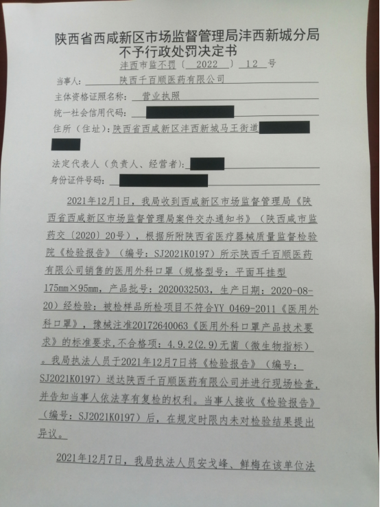 1 | (西咸沣西)市监不罚〔2022〕12号 | 陕西千百顺医药有限公司涉嫌经营不合格医疗器械案 | 陕西千百顺医药有限公司 | 91611104MA6TKCM30T | 焦凯 | 涉嫌经营不合格医疗器械 | 免除行政处罚 依据《医疗器械监督管理条例》第八十七条“医疗器械经营企业、使用单位履行了本条例规定的进货查验等义务,有充分证据证明其不知道所经营、使用的医疗器械为本条例第八十一条第一款第一项、第八十四条第一项、第八十六条第一项和第三项规定情形的医疗器械,并能如实说明其进货来源的,收缴其经营、使用的不符合法定要求的医疗器械,可以免除行政处罚”之规定 | 自接到行政处罚决定书之日起15日内 | 西咸新区市场监督管理局沣西新城分局 2022年04月19日 |