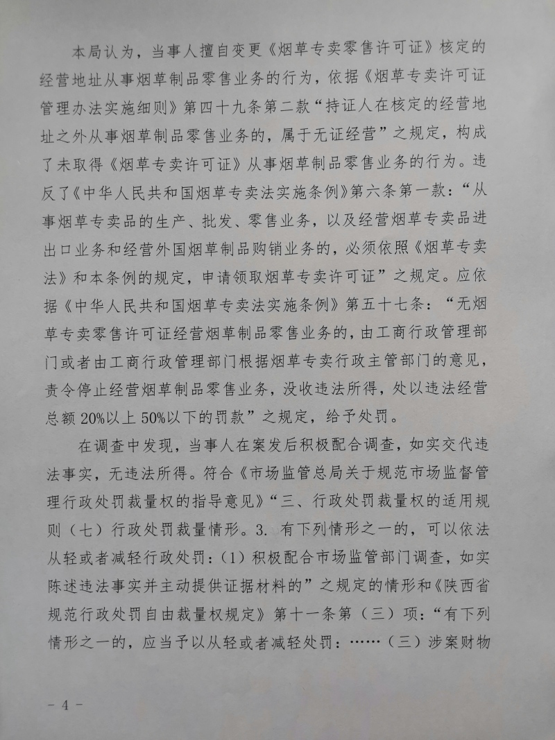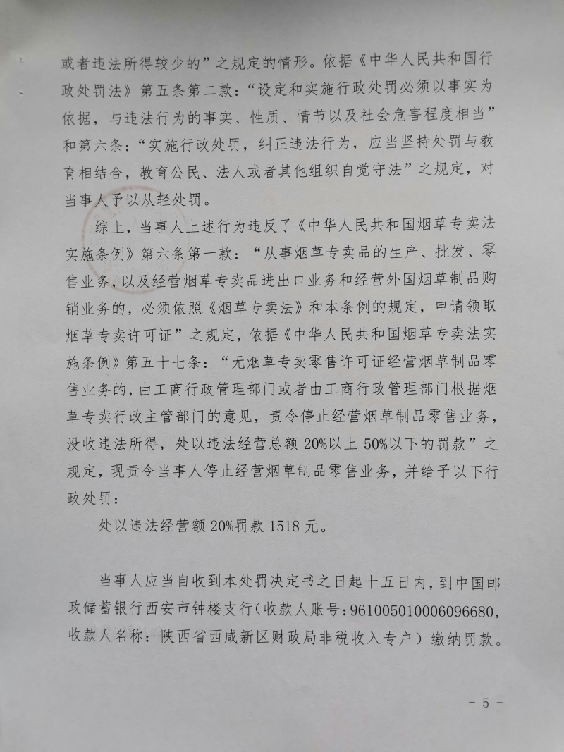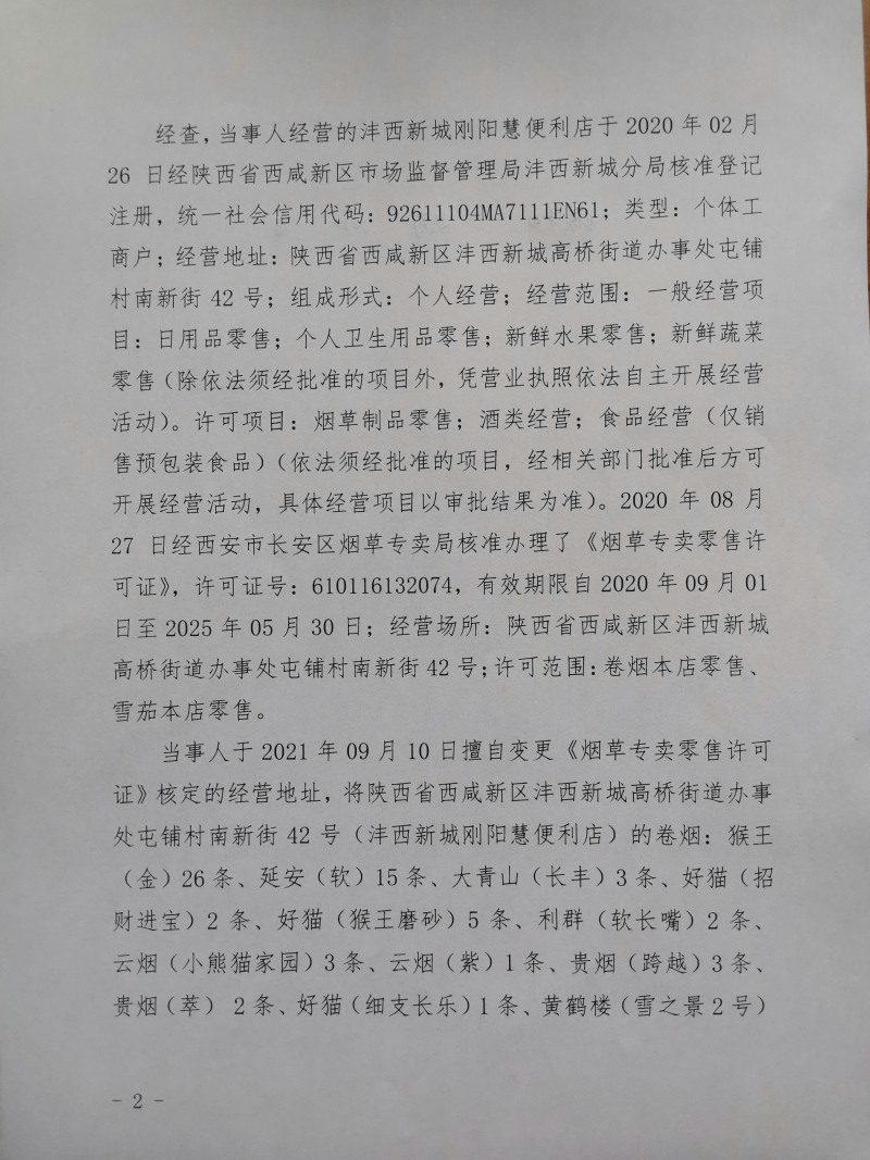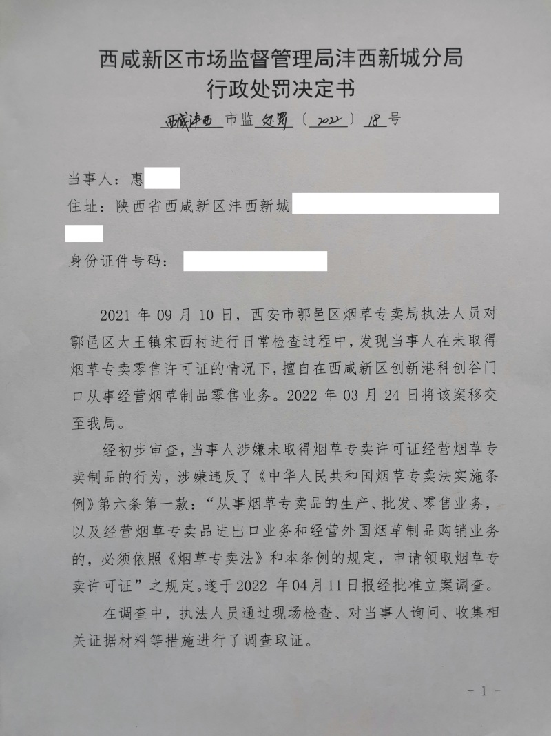 1 | (西咸沣西)市监处罚〔2022〕14号 | 惠复芝未取得烟草专卖零售许可证经营烟草专卖制品案 | 惠复芝 | / | / | 未取得烟草专卖零售许可证经营烟草专卖制品 | 处以罚款1518元。 违反《中华人民共和国烟草专卖法实施条例》第六条第一款。 依据《中华人民共和国烟草专卖法实施条例》第五十七条。 | 自接到行政处罚决定书之日起15日内 | 西咸新区市场监督管理局沣西新城分局 2022年04月28日 | |