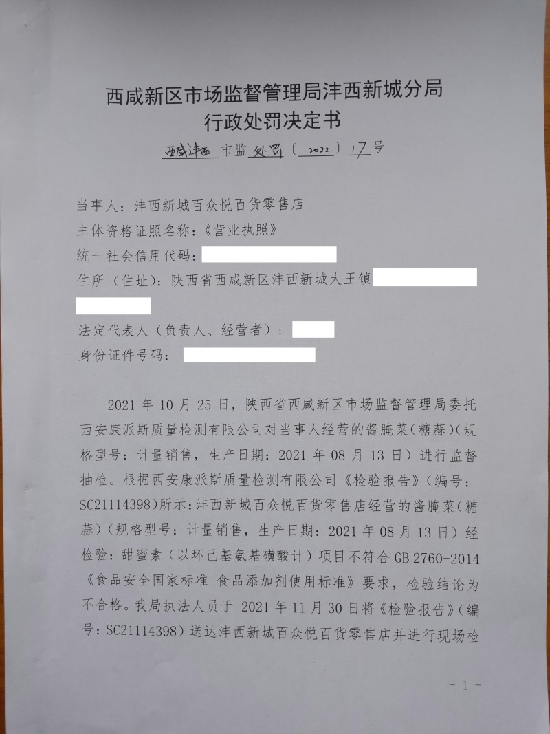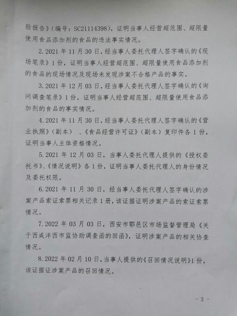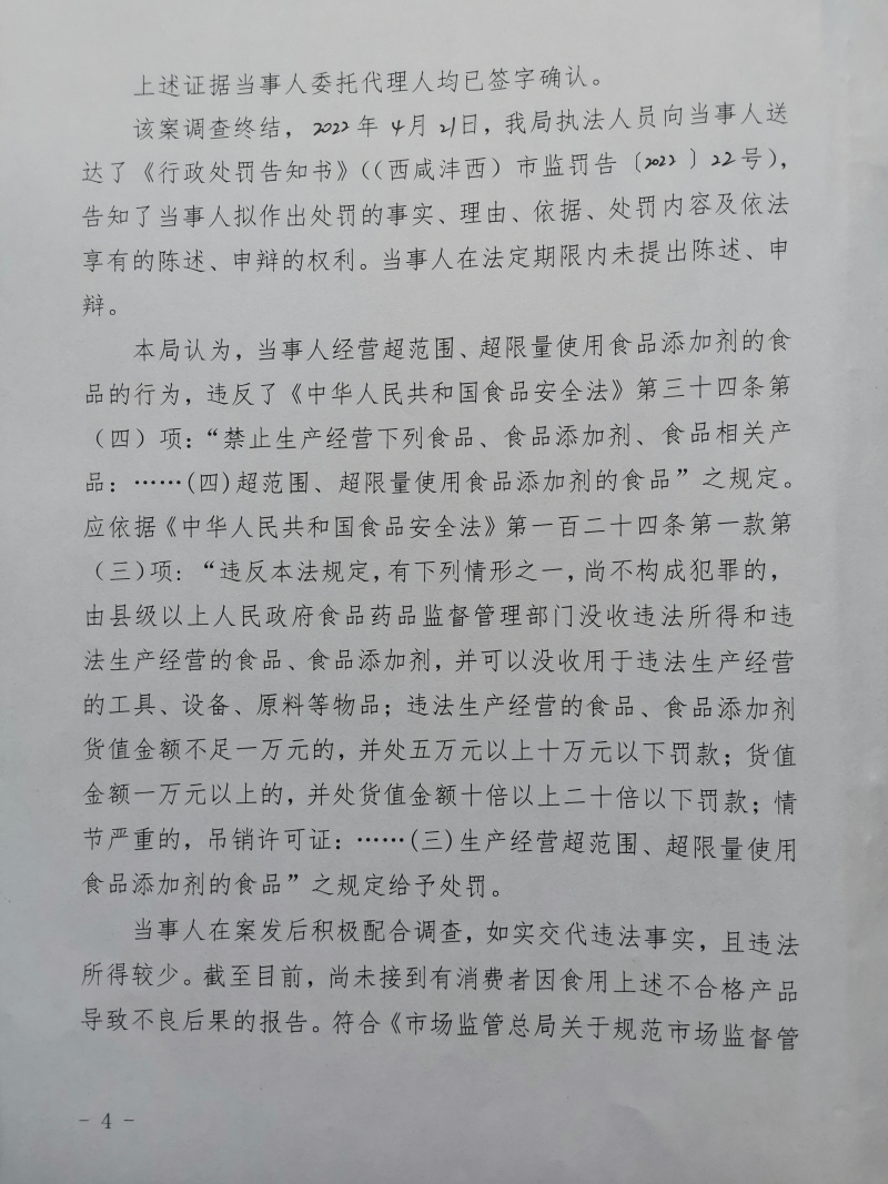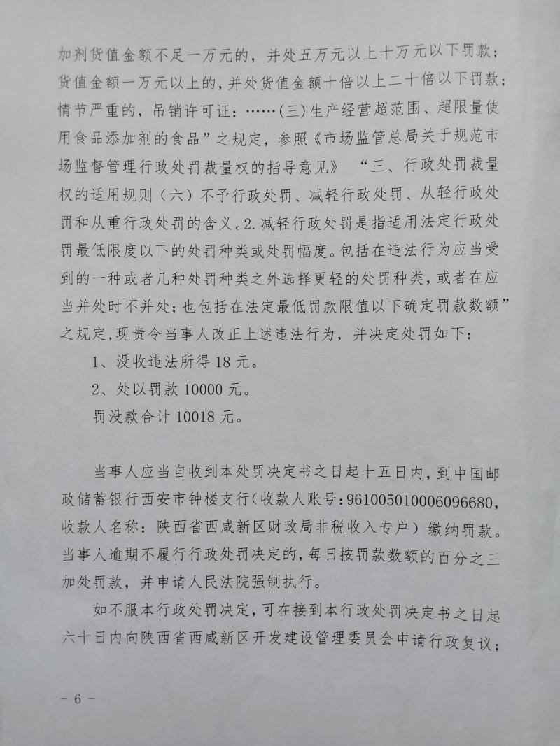 2 | (西咸沣西)市监处罚〔2022〕17号 | 沣西新城百众悦百货零售店经营超范围、超限量使用食品添加剂的食品案 | 沣西新城百众悦百货零售店 | 92611104MA6TL3KP9K | 马建户 | 经营超范围、超限量使用食品添加剂的食品 | 1、没收违法所得18元。 2、处以罚款10000元。 违反《中华人民共和国食品安全法》第三十四条第(四)项。 依据《中华人民共和国食品安全法》第一百二十四条第一款第(三)项。 | 自接到行政处罚决定书之日起15日内 | 西咸新区市场监督管理局沣西新城分局 2022年04月28日 |