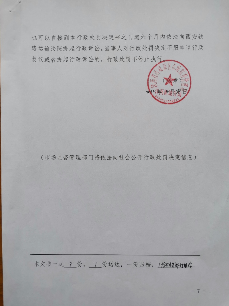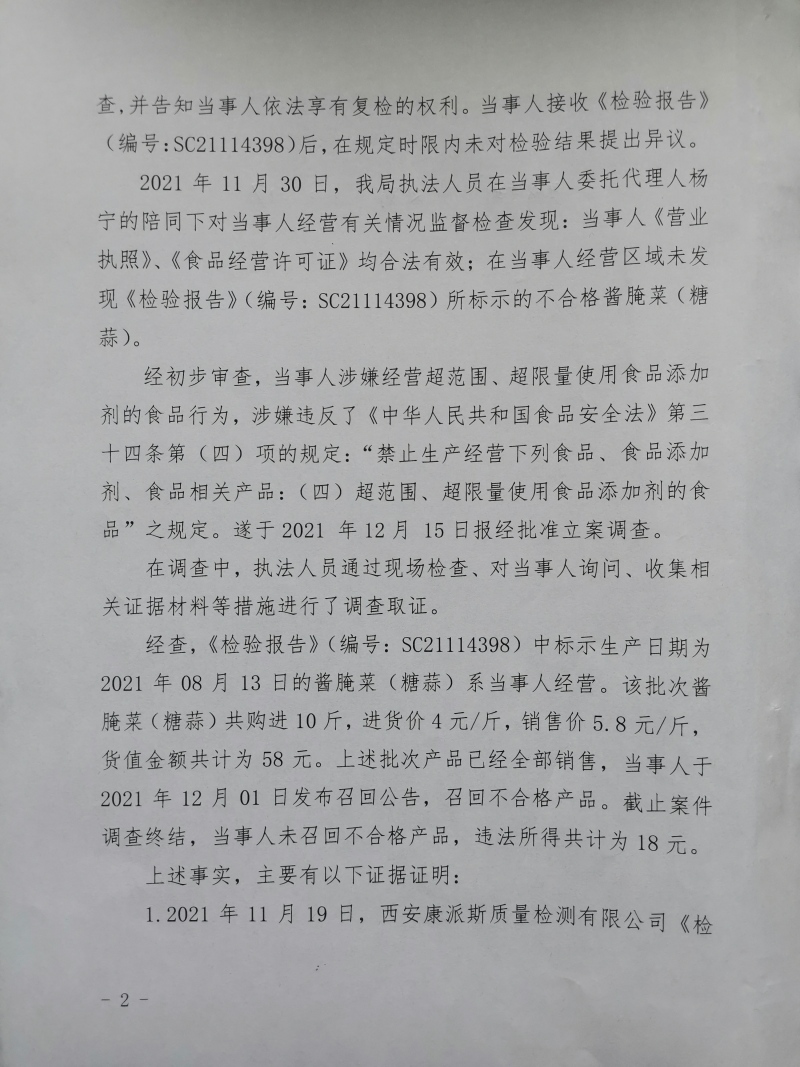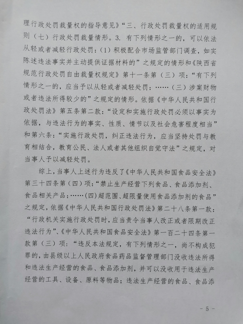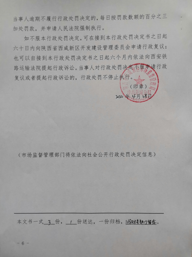 2 | (西咸沣西)市监处罚〔2022〕17号 | 沣西新城百众悦百货零售店经营超范围、超限量使用食品添加剂的食品案 | 沣西新城百众悦百货零售店 | 92611104MA6TL3KP9K | 马建户 | 经营超范围、超限量使用食品添加剂的食品 | 1、没收违法所得18元。 2、处以罚款10000元。 违反《中华人民共和国食品安全法》第三十四条第(四)项。 依据《中华人民共和国食品安全法》第一百二十四条第一款第(三)项。 | 自接到行政处罚决定书之日起15日内 | 西咸新区市场监督管理局沣西新城分局 2022年04月28日 |