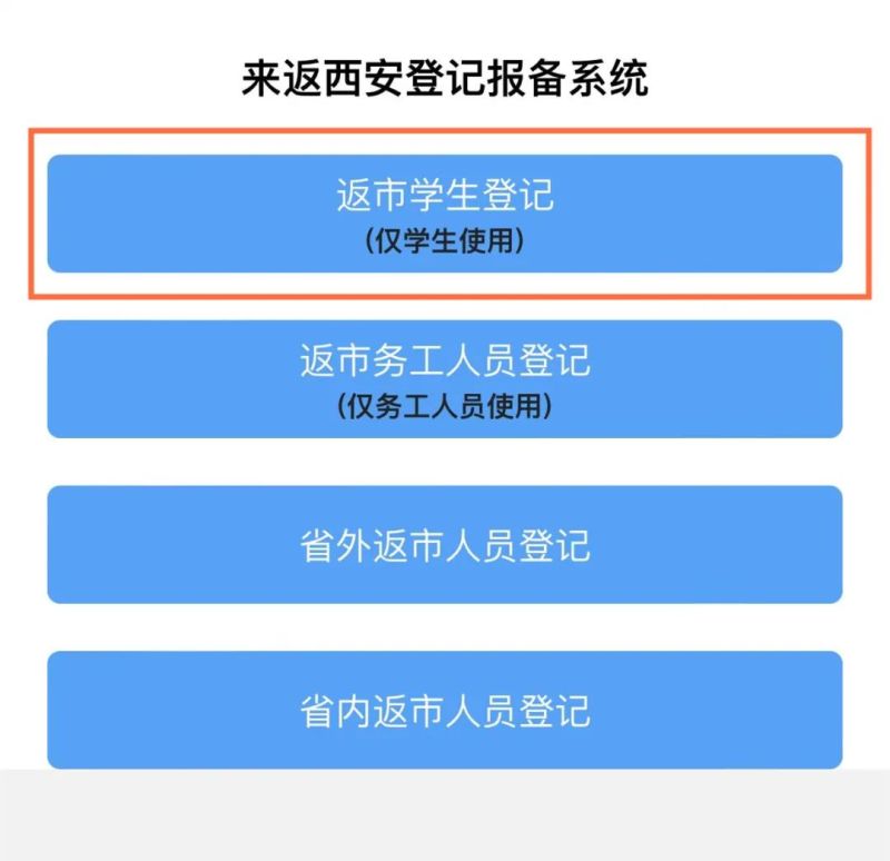 返乡大学生,请同学们在微信搜索小程序“来返西安登记报备”或扫描下面二维码,进入小程序页面,选择点击“返市学生登记”条目后按照指引填报个人信息。