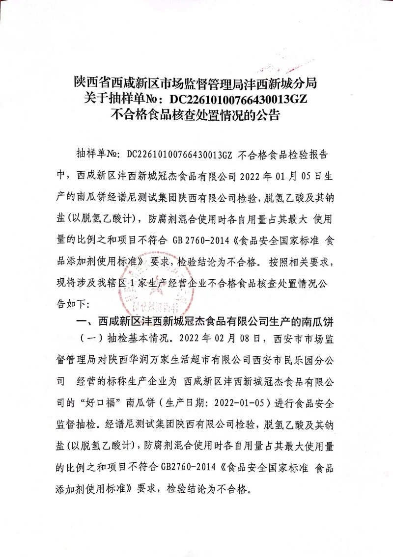 抽样单№:DC22610100766430013GZ 不合格食品检验报告中,西咸新区沣西新城冠杰食品有限公司2022年01月05日生产的南瓜饼经谱尼测试集团陕西有限公司检验,脱氢乙酸及其钠盐(以脱氢乙酸计),防腐剂混合使用时各自用量占其最大 使用量的比例之和项目不符合 GB 2760-2014《食品安全国家标准 食品添加剂使用标准》 要求,检验结论为不合格。 按照相关要求,现将涉及我辖区1家生产经营企业不合格食品核查处置情况公告如下: