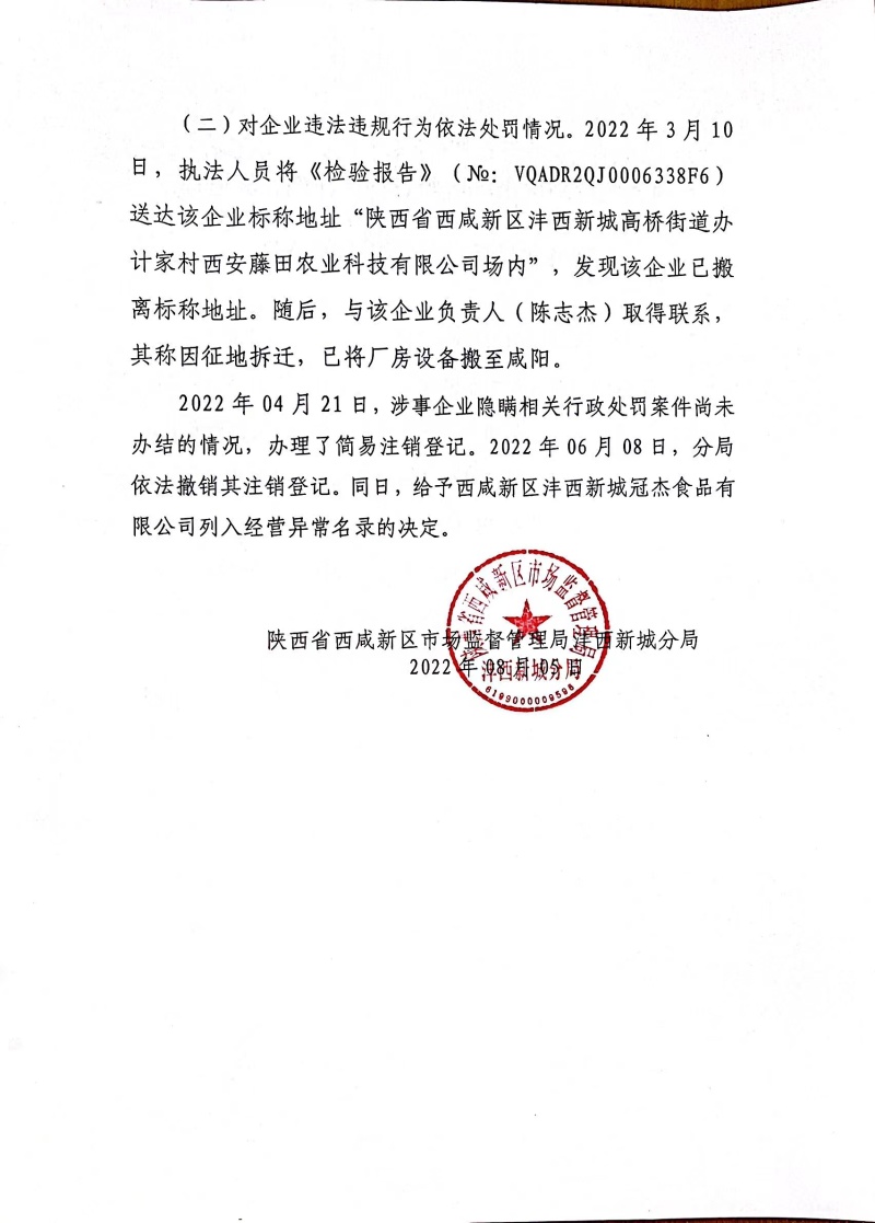 2022年04月21日,涉事企业隐瞒相关行政处罚案件尚未办结的情况,办理了简易注销登记。2022年06月08日,分局依法撤销其注销登记。同日,给予西咸新区沣西新城冠杰食品有限公司列入经营异常名录的决定。