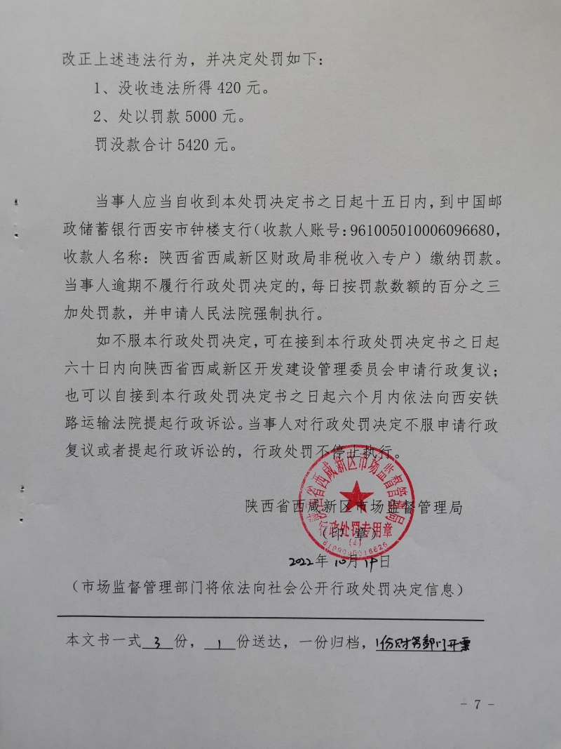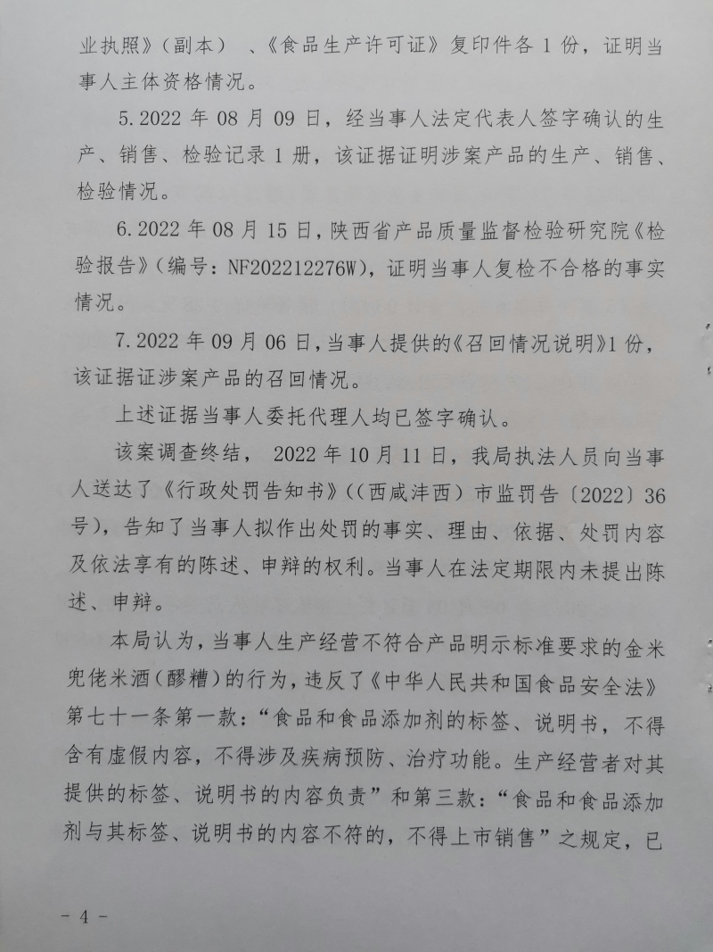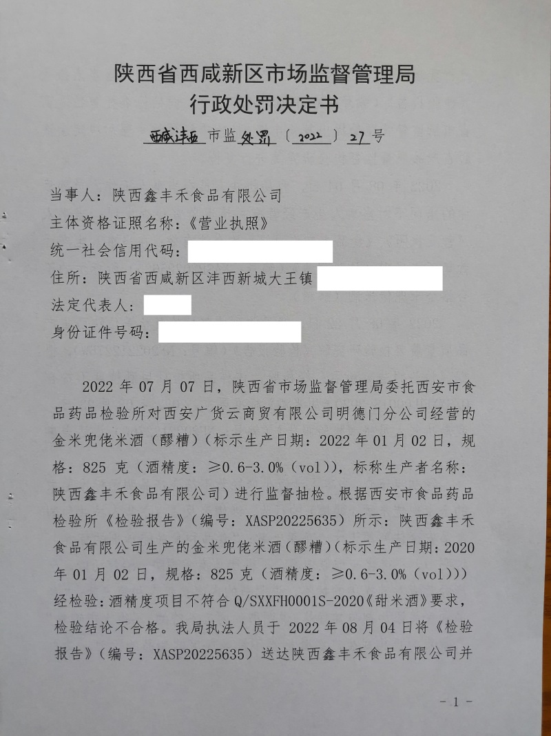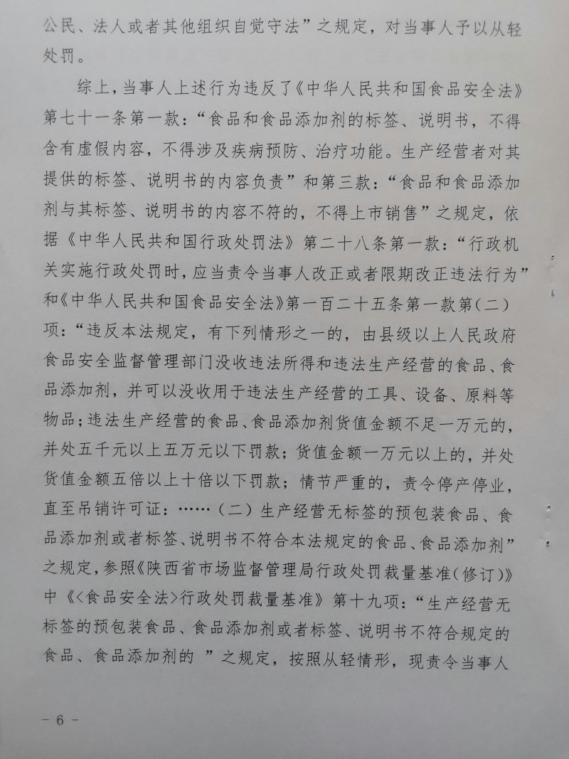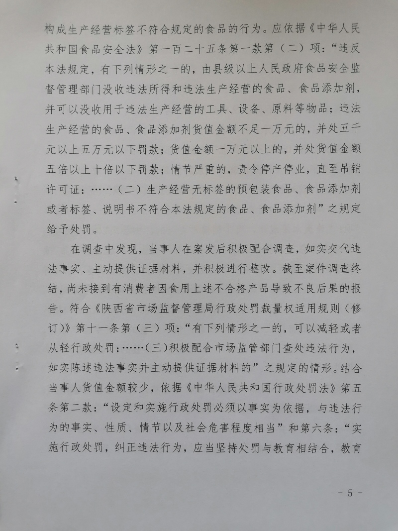 1 | (西咸沣西)市监处罚〔2022〕27号 | 陕西鑫丰禾食品有限公司生产标签不符合规定的食品案 | 陕西鑫丰禾食品有限公司 | 91611104MA717GAU1X | 胥万春 | 生产经营标签不符合规定的食品 | 1、没收违法所得420元。 2、处以罚款5000元。 违反了《中华人民共和国食品安全法》第七十一条第一款、第三款之规定。 依据《中华人民共和国食品安全法》第一百二十五条第一款第(二)项。 | 自接到行政处罚决定书之日起15日内 | 西咸新区市场监督管理局沣西新城分局 2022年10月19日 | |