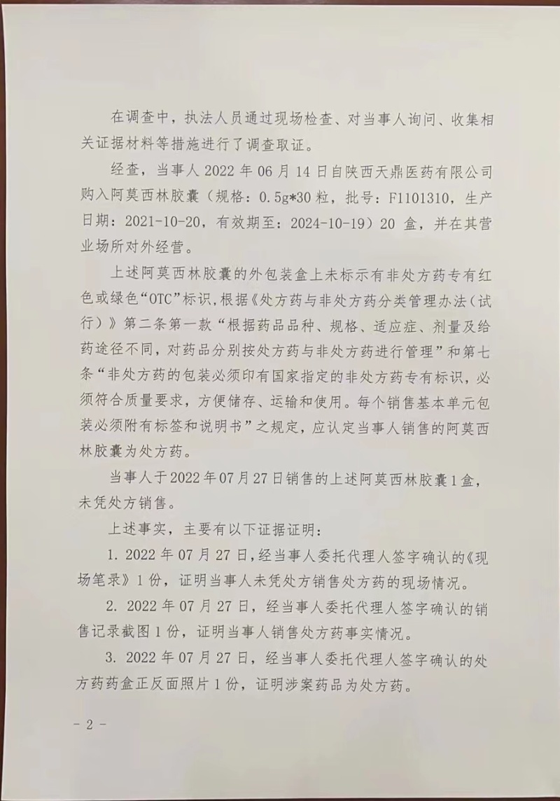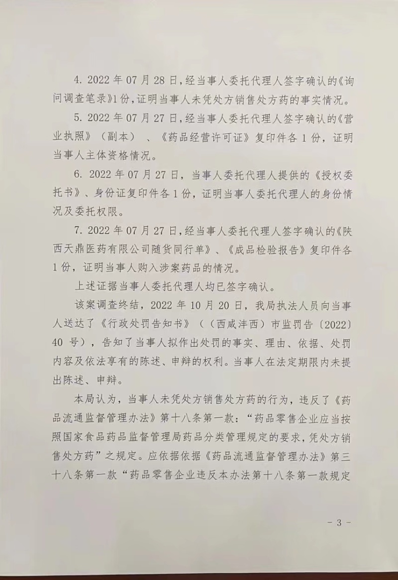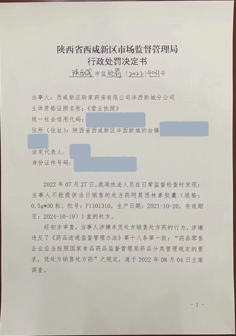 1 | (陕西咸)市监处罚〔2022〕4031号 | 西咸新区聆家药房有限公司沣西新城分公司涉嫌未凭处方销售处方药的药品案 | 陶亚静 | 91611104MA6TG2Y462 | / | 未凭处方销售处方药 | 处以罚款800元。 违反《药品流通监督管理办法》第十八条第一款。 依据《药品流通监督管理办法》第三十八条第一款。 | 自接到行政处罚决定书之日起15日内 | 陕西省西咸新区市场监督管理局 2022年10月28日 |