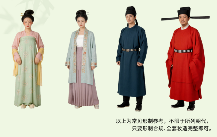 女子可选择汉代直裾、唐制齐胸/齐腰襦裙、宋制褙子、明制马面裙等。