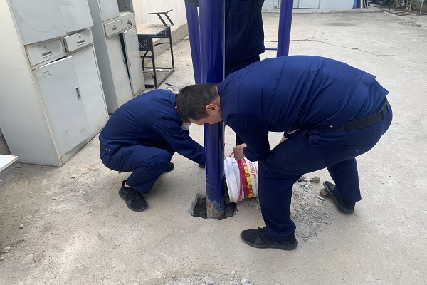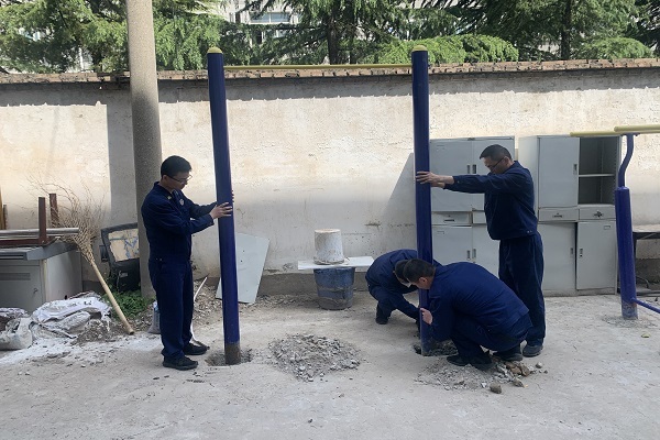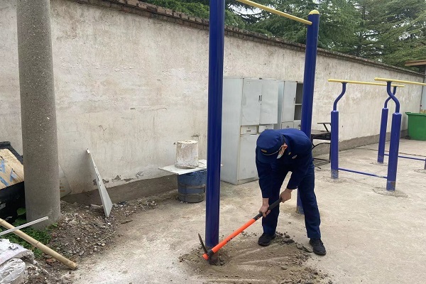 沣润小型站队员对存在隐患的公共健身器材进行维护修缮方案制定,首先对不稳固的单杠器材进行底部挖掘,随后对其重新进行混凝土浇筑,最后对双、单杠进行检查、擦拭清理,部件进行紧固。