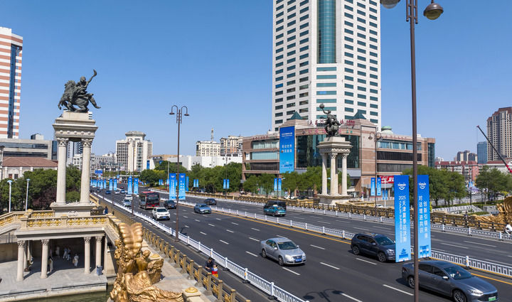 天津市大光明桥道路两旁路灯上悬挂着2025夏季达沃斯论坛宣传标语(6月21日摄)。